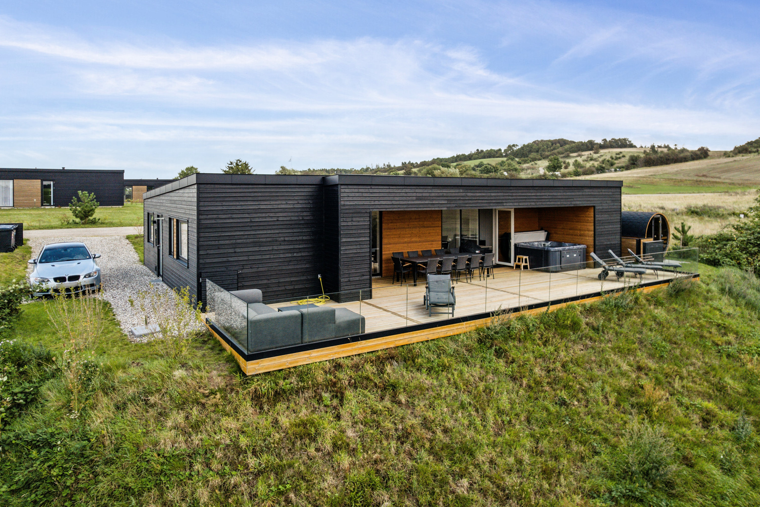 Udenfor fortsætter oplevelsen på den 80 m2 store terrasse med glasværn, hvor soltimerne kan tilbringes i loungemøblerne eller solvognene. Nyd en dukkert i udespaen, eller lad aftenerne glide langsomt afsted i tøndesaunaens varme. Børnene kan boltre sig på legestativet, mens en nyplantet frugtlund – fyldt med æbler, pærer og blommer – lover søde smagsprøver.