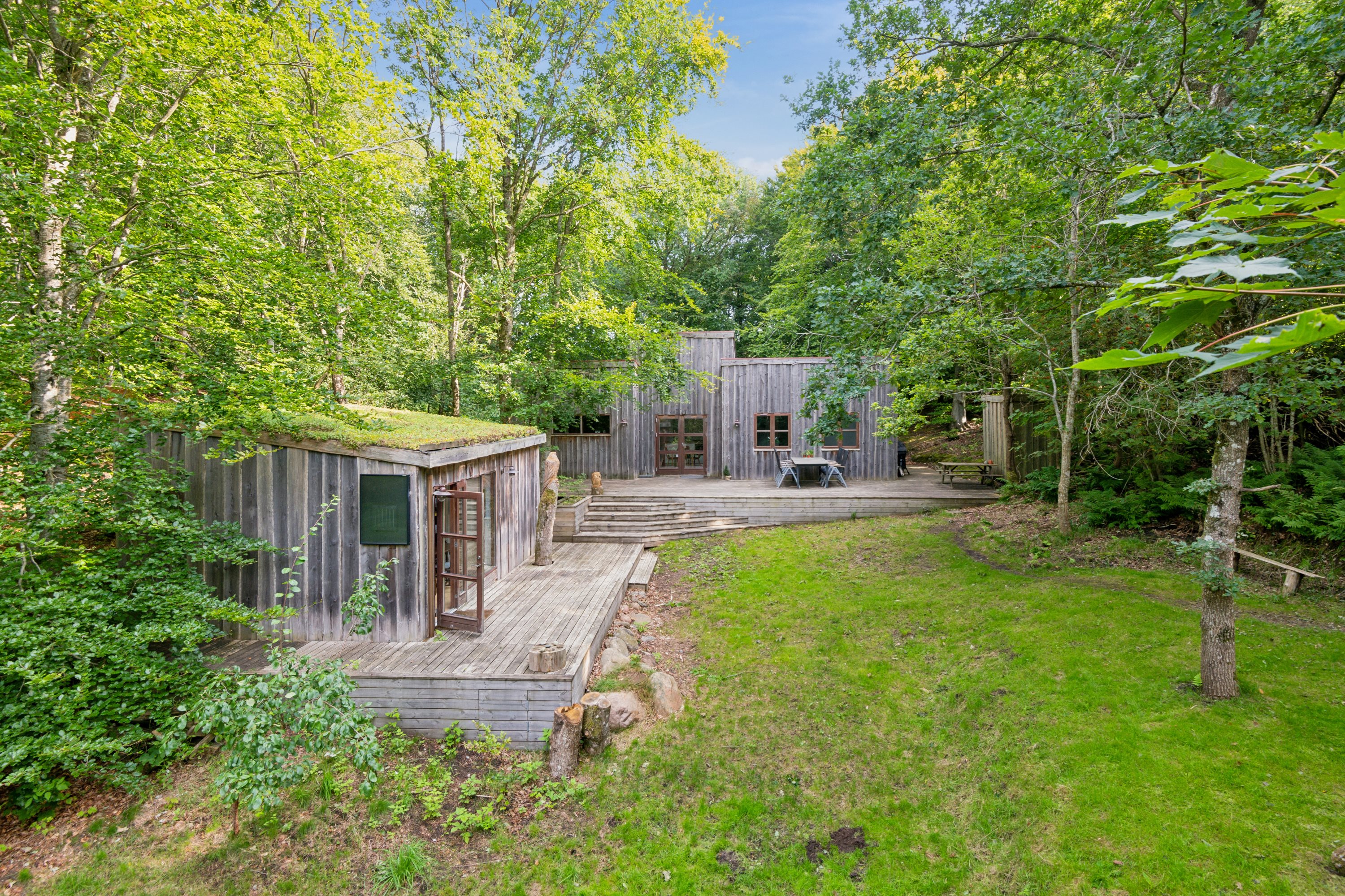 Naturen bliver bestemt ikke efterladt ved matrikelgrænsen, tværtimod, så udfolder den sig smuk og frodig på den dejlige store grund. Terrassemiljøer svøber sig om hele huset, og dertil kommer bålpladsen, skuret og de fine træfigurer, der har indtaget lysningen omkring det lækre træhus.