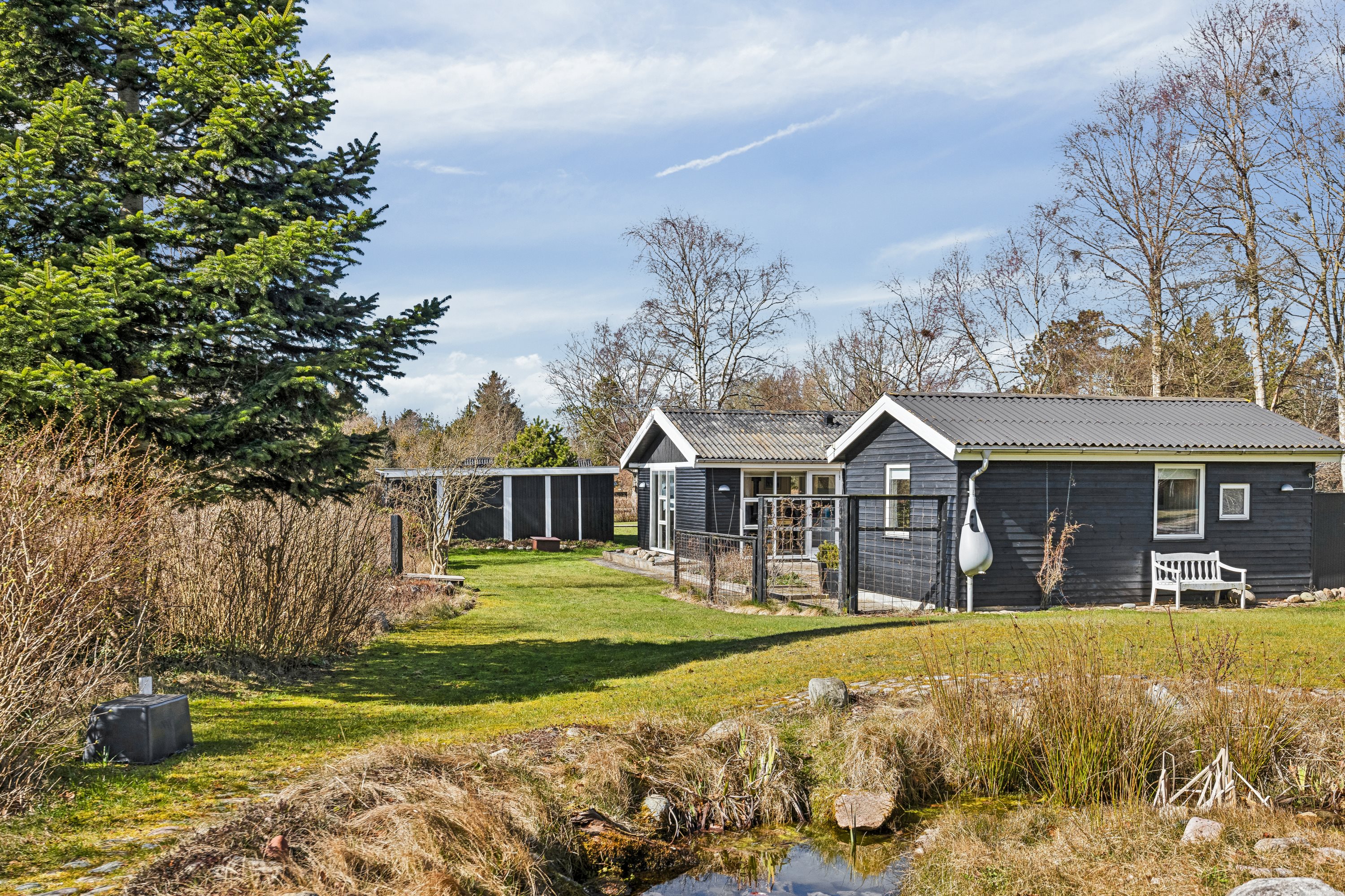 En indbydende grund med gode sol- og hyggekroge hører med i prisen. Mellem huset og dens anneks putter sig en stor terrasse med næsen vendt mod syd, og her er der garanti for lune sommerdage, men I kan også søge skygge og ly under terrassens overdække. Endnu en terrasse byder sig til på husets vestvendte side, mens grunden endvidere råder over en nem plæne, et udhus samt en fin, lille sø.