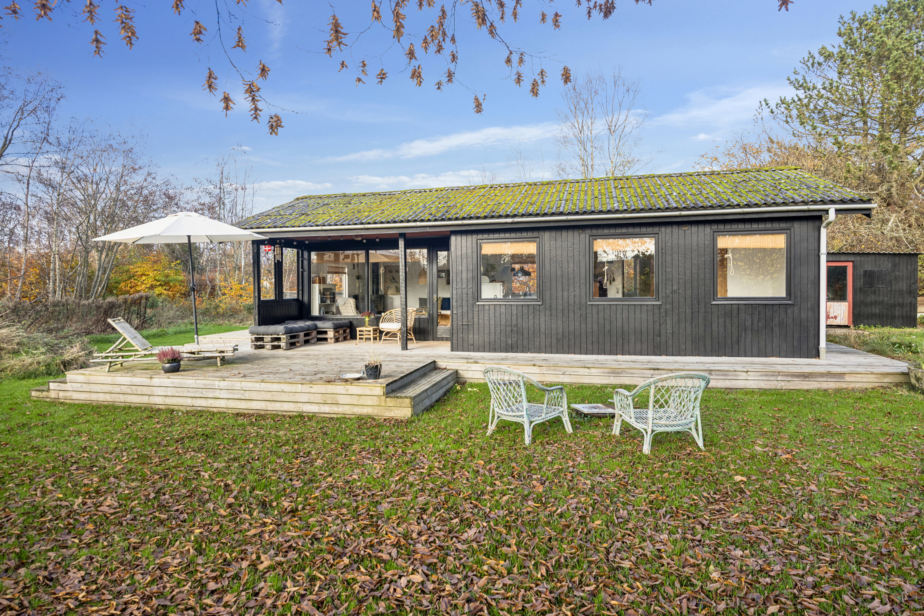Det fine sommerhus stod færdigbygget i 1972, og de mørkmalede trævægge giver masser af feriestemning fra første blik. En særlig gevinst er husets store terrasse, der giver jer solpletter mod syd, øst og vest; så I kan følge solens bane i løbet af dagen, fra den tidlige morgenkaffe til det sidste glas vin på en lun sommeraften. Den store have giver plads til leg og boldspil, og de høje træer afskærmer jer næsten hele vejen rundt.