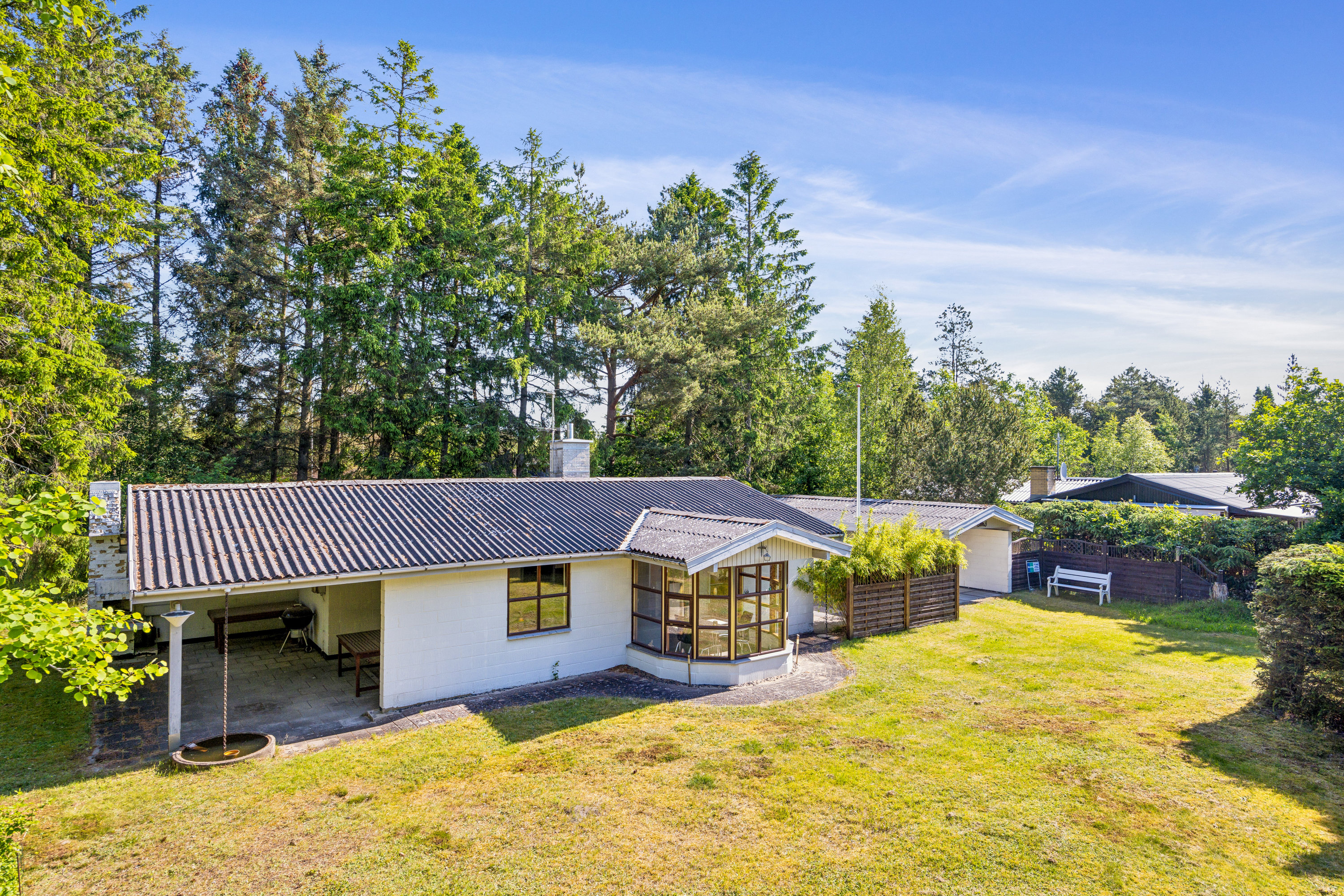 Som øjet falder på det fine hus fra 1970, er det som om, skuldrene sænker sig med det samme, og det arkitektoniske udtryk oser bare af sommerhuscharme og ferieidyl. Huset ligger tilmed på en 1.293 m2 stor grund, der breder sig som en skøn naturgrund indhyllet i trætoppe med et fint græsstykke perfekt til de aktive og en hyggelig, overdækket terrasse som skabt til hyggestunder i læ for vind og vejr. Der er tilmed carport og redskabsrum, som kan bruges til opbevaring eller som et lille værksted.