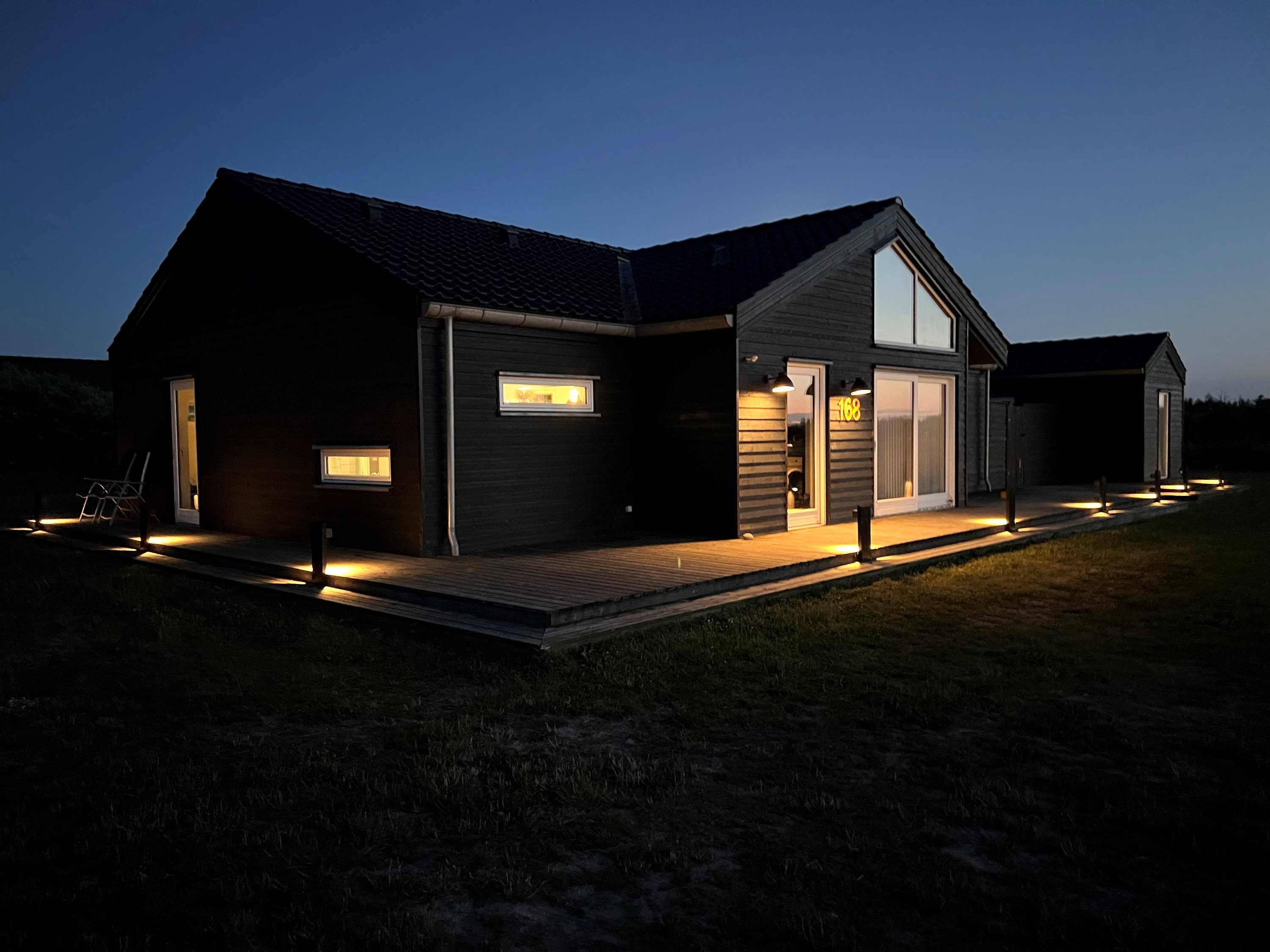 Der en skøn træterrasse hele vejen rundt om huset, hvor der også er adgang til anneks og mobilt sauna og udhus på 16 m2 . Sommerhuset er udlejet igennem Dancenter, og giver en rigtig god lejeindtægt. Der er stadig mulighed for at benytte sommerhuset selv.