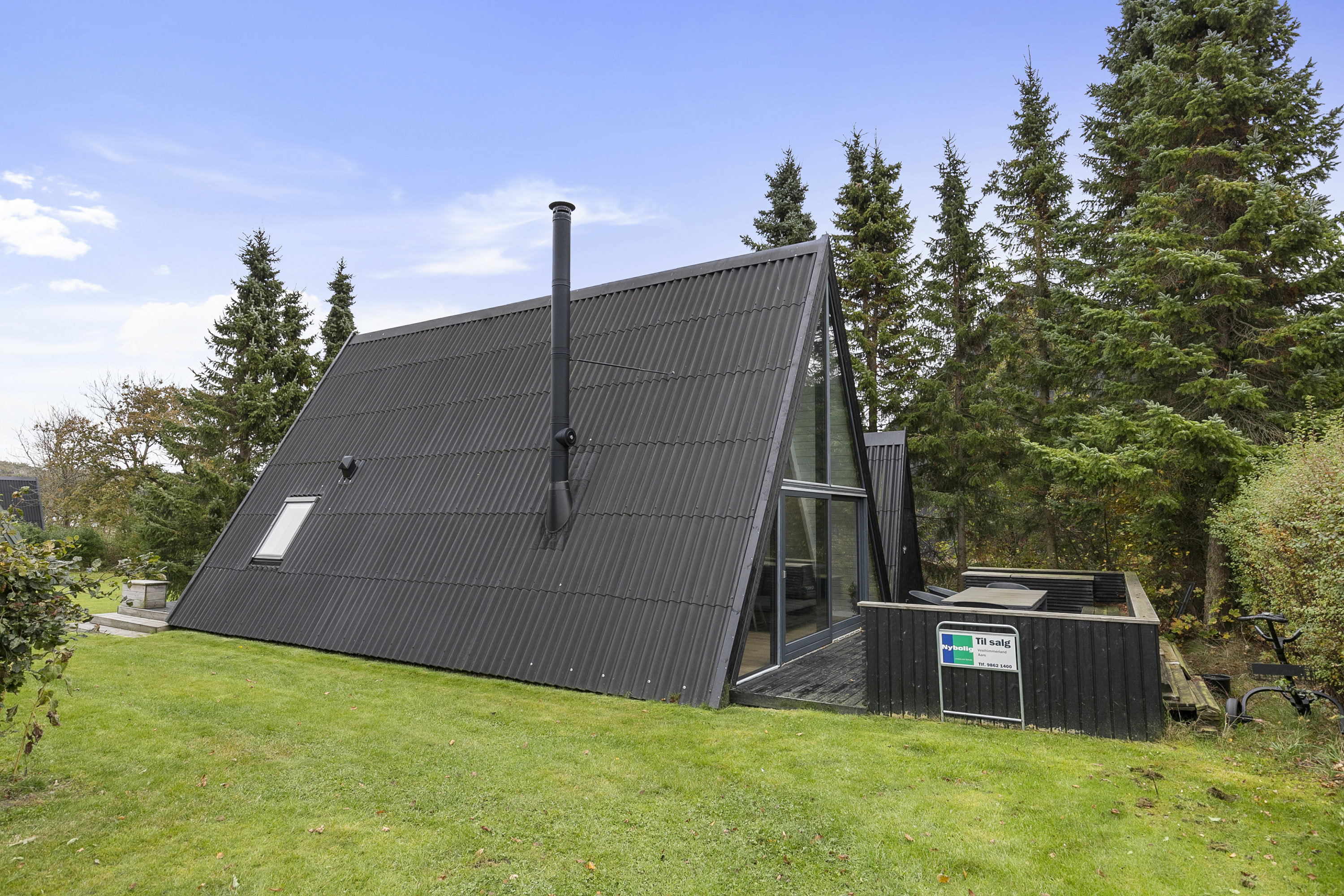 Fritidshus på 89 m² fra 1981, moderniseret i 2016, placeret på en lukkede grund på 234 m². Førstehåndsindtrykket fanger øjet: A-formet tag og store trekantede glaspartier, der åbner facaden og lukker lys ind i boligens ophold. Den mørke træbeklædning og den hævede terrasse skaber et afgrænset udeområde, hvor du får både privatliv og grøn udsigt mod grantræer og græsplæne.Indvendigt møder du en åben planløsning mellem køkken og stue, samlet i ét stort opholdsrum med synlige hvide bjælker og lyst trægulv. Køkkenet har et rummeligt arbejdsareal med indbygget ovn og kogeplade samt plads til barstole ved en halvø, og der er direkte adgang til terrasse. I stueplan findes desuden et badeværelse med vindue mod himlen samt et praktisk bryggers med plads til vaskemaskine. Den fritstående brændeovn samler rummet og giver stemning og varme.Huset rummer to soveværelser på 1. sal, adskilt af en repos, hvorfra det store trekants-vindue kaster lys ned over stuen. Vinduespartierne i gavlen skaber et stærkt visuelt fokus og giver kontakt til udearealerne. Udvendigt byder huset på flere terrasser — både en lav terrasse ud mod haven og en hævet træterrasse med indbygget siddebanket, som forlænger opholdet udendørs. Der er desuden et mindre udhus/anneks til opbevaring.Belægningen afgrænser et roligt sommerhusmiljø omgivet af grønt, og grundens størrelse gør haven overskuelig at vedligeholde. Den arkitektoniske form og de store glaspartier gør boligen velegnet som feriebase eller som weekendtilflugtssted, hvor samvær foregår i ét samlet rum på stueplan og privatliv bevares på 1. sal. Materialevalget fra renoveringen i 2016 med lyse overflader og sorte bordplader i køkkenet giver et moderne udtryk med gode muligheder for personlig indretning.Kort sagt får du et indbydende fritidshus med åben planløsning, markante vinduespartier, to soveværelser og flere terrasser på en nem grund. Huset står i indflytningsklar stand efter 2016-modernisering, og den enkle planløsning gør det let at bruge året rundt. Kontakt os for en fremvisning og oplev, hvordan huset fungerer i praksis.