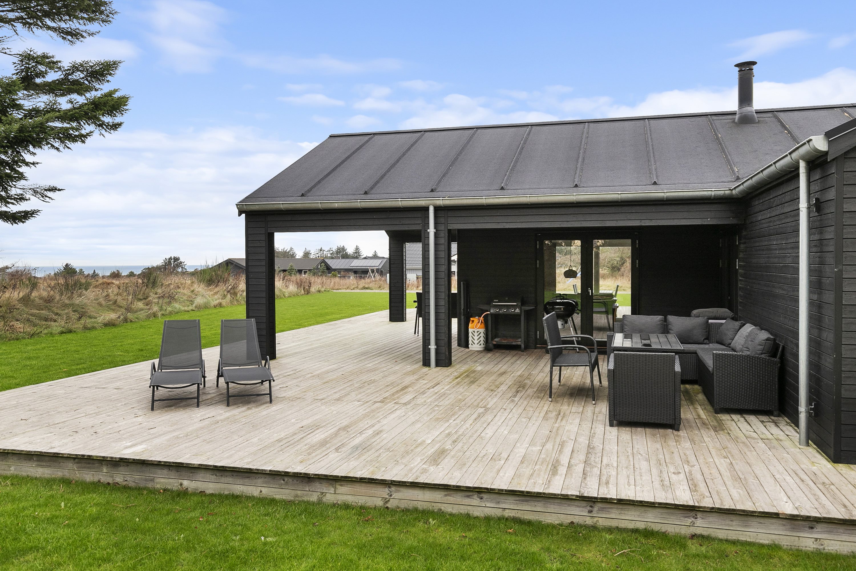 Den tilhørende terrase inviterer til hyggelige sommeraftener, hvor I kan slappe af med en god bog eller nyde middag under stjernerne. Huset ligger på en generøs grund på 3515 kvadratmeter, hvilket giver rig mulighed for udendørs aktiviteter, leg og afslapning i naturen.