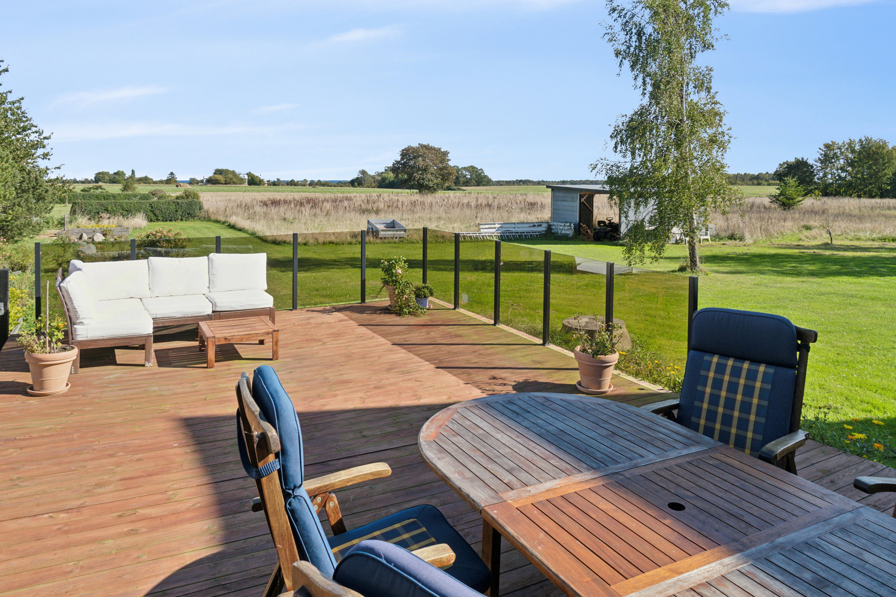 Udenfor er der en terrasse med plads til udeliv, hvorfra der er udsigt og mulighed for at nyde solopgangen. En lille sø og et mangfoldigt udvalg af træer understøtter ejendommens naturnære bagtæppe, og de åbne arealer giver desuden plads til dyrehold.