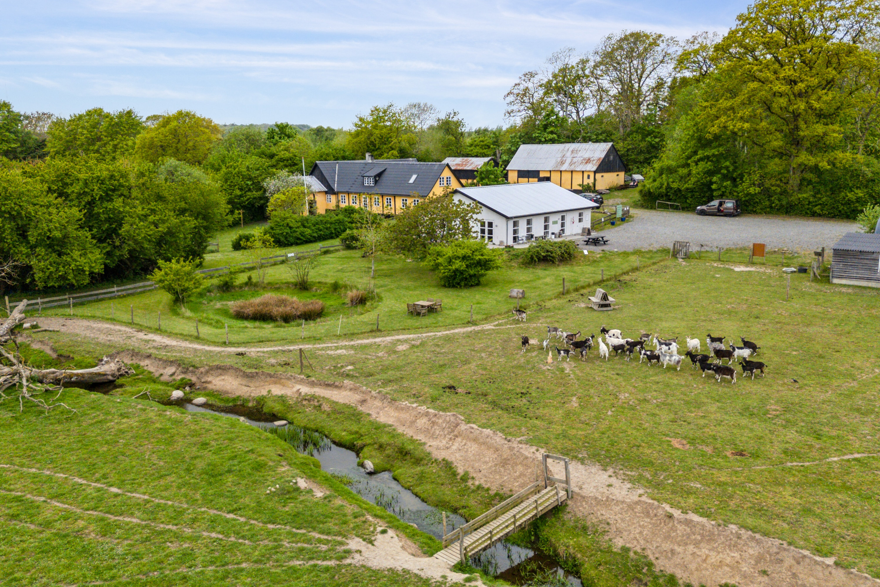 Godt skjult fra vejen og i læ af skovens træer ligger denne spændende ejendom, der kombinerer gedemejeri med privat beboelse.