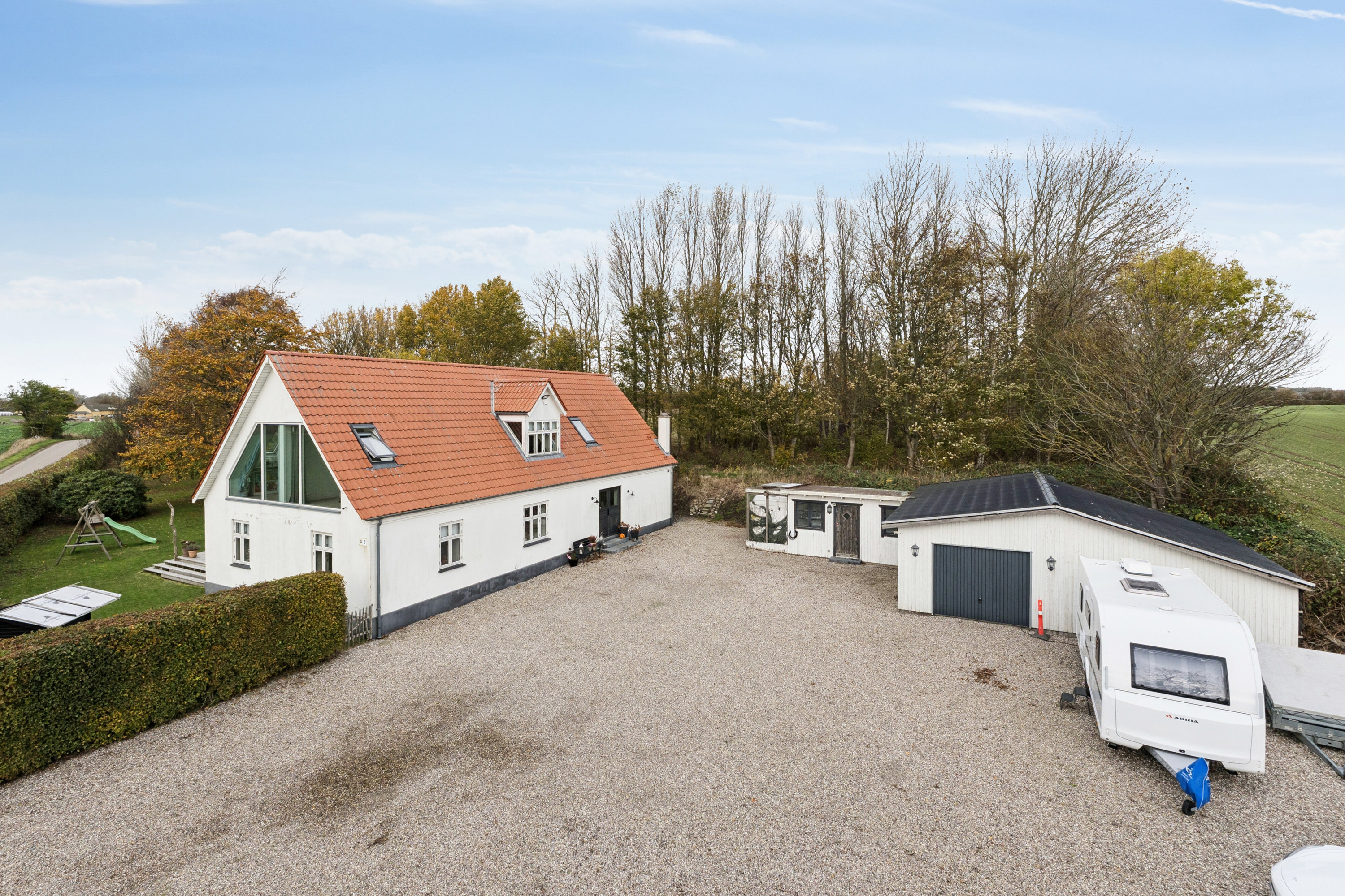 Udenfor får I hele 20.938 kvm grund med rigelig luft omkring jer. Den store have er et grønt frirum til både leg og afslapning på den solrige træterrasse, mens de omkringliggende marker og åbne landskaber skaber en rolig, idyllisk og smuk ramme. Til huset hører der også et praktisk udhus med værksted, garage og et disponibelt rum.