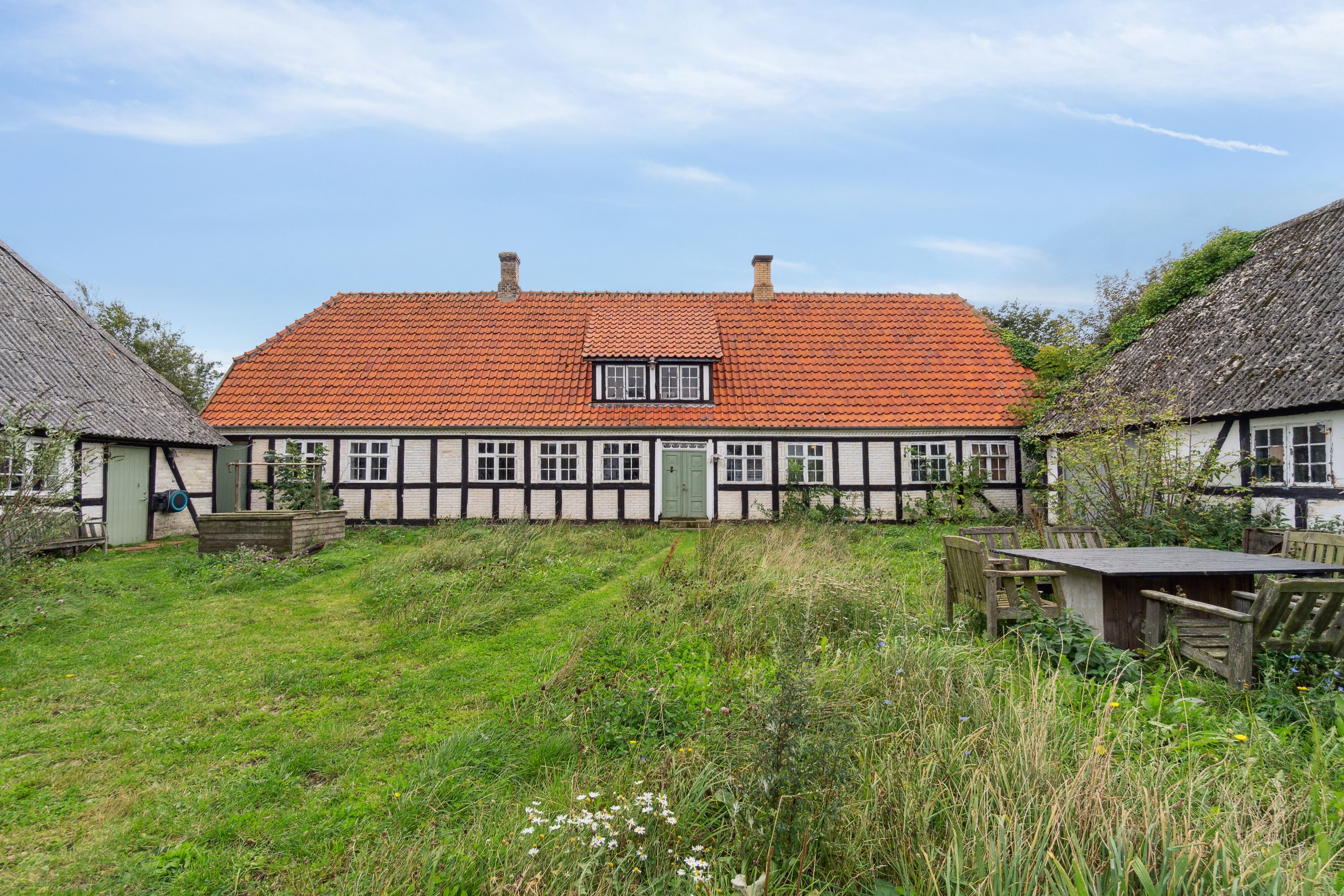 Her emmer stadig af 1809 - med gamle trægulve, papirlofter, sprossevinduer, bindingsværk og pigsten på gårdspladsen