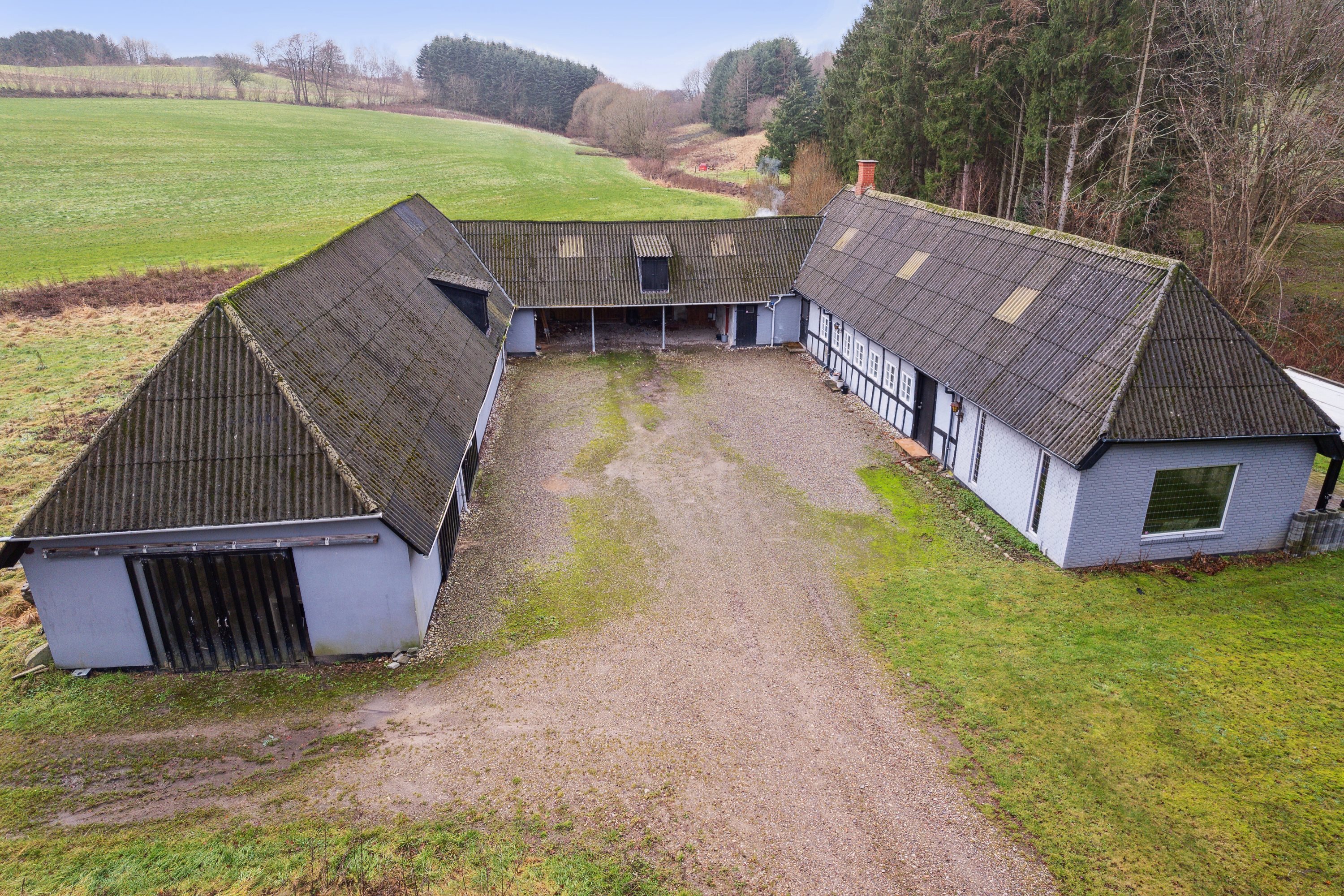 Den 3-længede ejendom danner ramme om en hyggelig gårdsplads, hvor udhusbygningerne er indrettet med et laderum, en ældre stald samt en carport.
