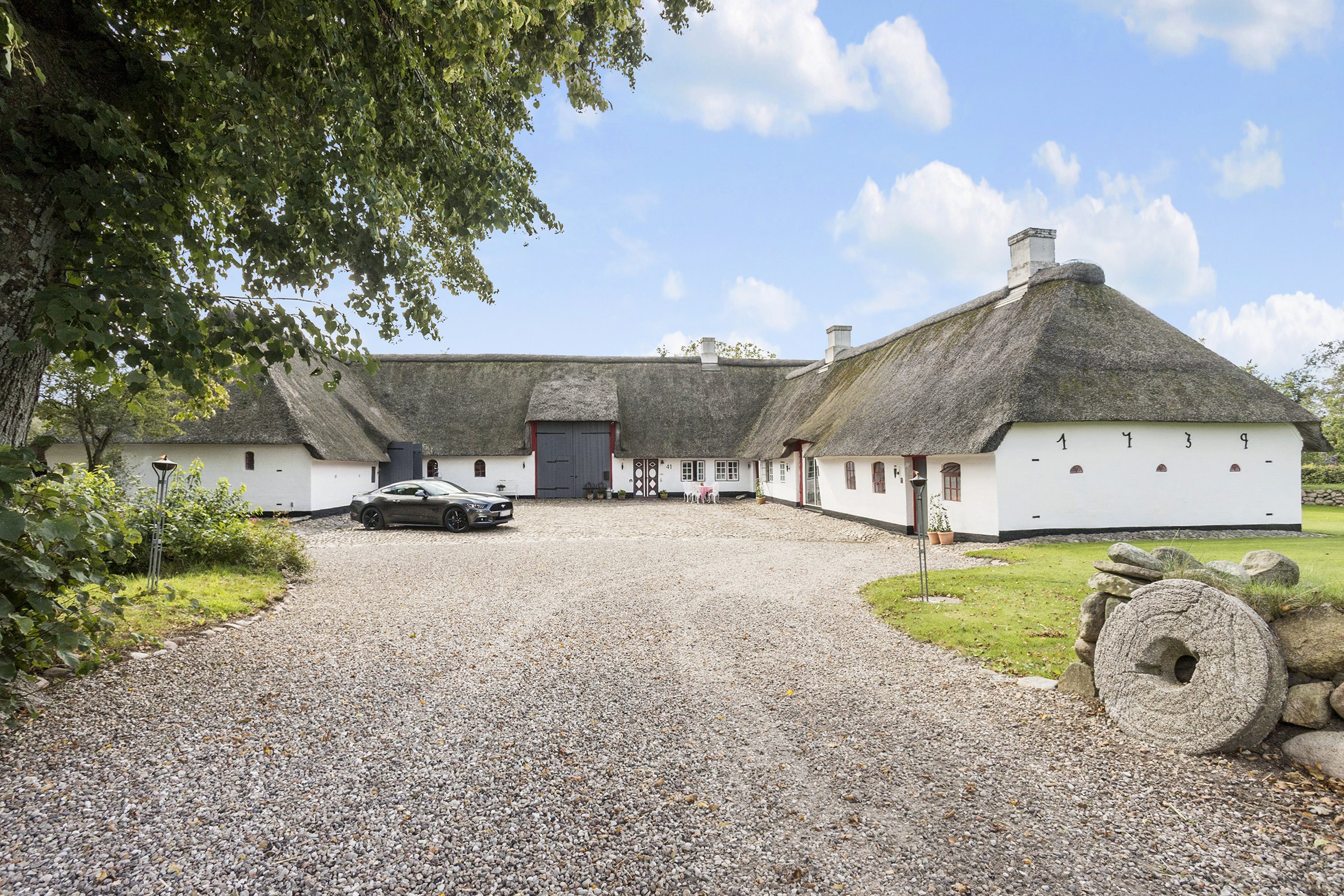 Denne charmerende og fredede ejendom ligger midt i den hyggelige landsby Røllum og byder på en særlig historisk atmosfære. Gården, som kan spores tilbage til 1739, står med stråtag, hvidkalkede mure og en sort sokkel, hvilket giver ejendommen et klassisk og tidløst udtryk. Den pigstensbelagte gårdsplads fører jer ind til den trelængede gård med et sydvendt stuehus, en nyrenoveret vestvendt længe og en østvendt avlslænge. Med en grund på over 5,2 hektar er der også mulighed for tilkøb af yderligere jord, hvilket giver god plads til både hestehold og andre aktiviteter.