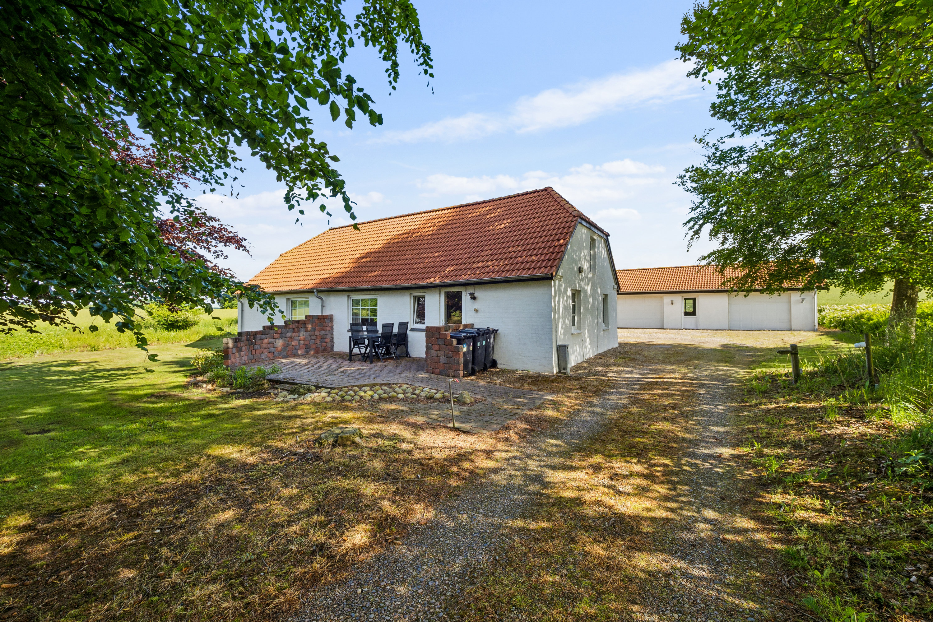 Et hjem med højt til himlen og naturen som nærmeste nabo; det – og meget mere – er, hvad I får på Præstevejen 70. Indrammet af åbne marker ligger den 4.745 m2 store matrikel, som danner ramme om både en dejlig villa og en stor garage, der giver jer rigelig plads til hobbyliv og værksted. Det tager kun 15 minutter at køre turen fra jeres nye adresse og ind til Skive, som står til rådighed med alt, hvad I skal bruge i det daglige, og så selvfølgelig et hyggeligt byliv. Derudover bor I helt tæt på Rønbjerg, som har både daginstitution og foreningsliv, og så er I omgivet af den skønneste natur, så sæt eksempelvis kursen mod Flyndersø, når I vil nyde gåture i den friske luft. Tilbage på adressen er både hus og garage placeret helt perfekt med lang afstand til Præstevejen, så der er ro og privatliv omkring jer. Når I kommer kørende ind på den lukkede gårdsplads, præsenteres I for begge bygninger, som matcher hinanden i facade og tagsten. I kan desuden glæde jer over, at huset er opdateret med et rødt betontagstenstag. Garagen blev opført i 2007, og den er udstyret med to elporte, der åbner op til de 91 m2, hvor I kan give plads til biler, motorcykler, gør-det-selv-projekter og meget andet. I får yderligere bonuskvadratmeter under samme tag som boligen, hvor I finder endnu en garage, så I mangler ikke plads til jeres hobbyliv. Selve boligen råder over 158 m2 i ét plan, hvor I blandt andet får et bryggers, et badeværelse og fire værelser, der fordeler sig to og to på to separate afdelinger – og den ene afdeling bindes sammen af et hyggeligt opholdsrum med brændeovn, så der er plads til et hjemmekontor, børnenes krearum eller noget helt tredje. Til slut går rundturen mod spisekøkkenet og den tilstødende stue, som sætter scenen for familietid og samvær – og så er det også fra stuen, at I træder direkte ud til sol og sommer på den sydvendte terrasse, hvor I kan være helt jer selv, mens I nyder den naturskønne udsigt.