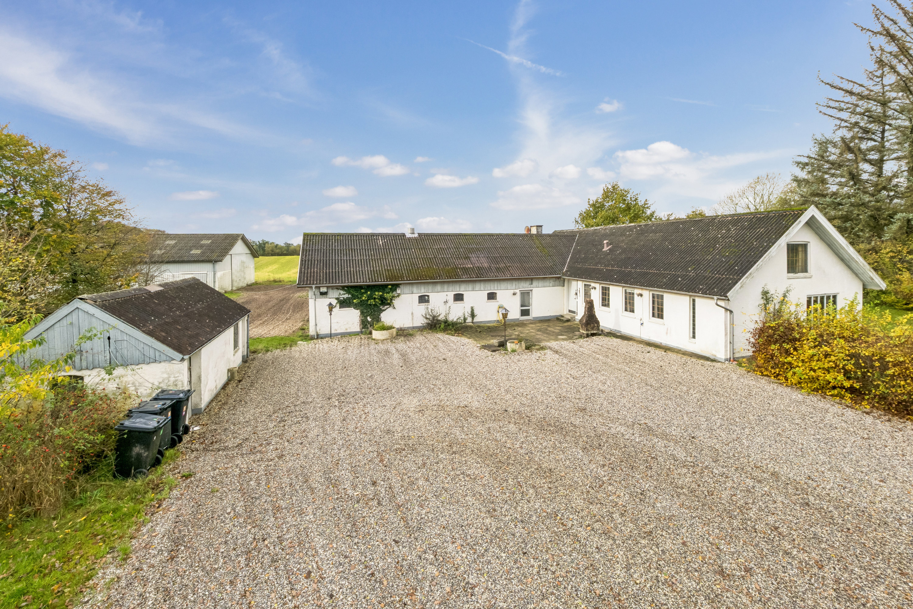 Der er udsigt til markerne i alle retninger, når I ankommer til ejendommen, som ligger i fred, ro og landlig idyl. Ud mod gårdspladsen finder I bl.a. stuehuset, som byder på 218 m2 med potentiale. Her kan I sætte jeres eget præg på et hjem med indbygget charme, for fyldningsdøre og blotlagte bjælker møder jer rundt om i huset. På jeres vej støder I bl.a. på et gæstetoilet, et badeværelse, et oplagt viktualierum, tre værelser og hjemmets opholdsrum, som tæller køkken-alrummet og en stor stue med fri markudsigt.