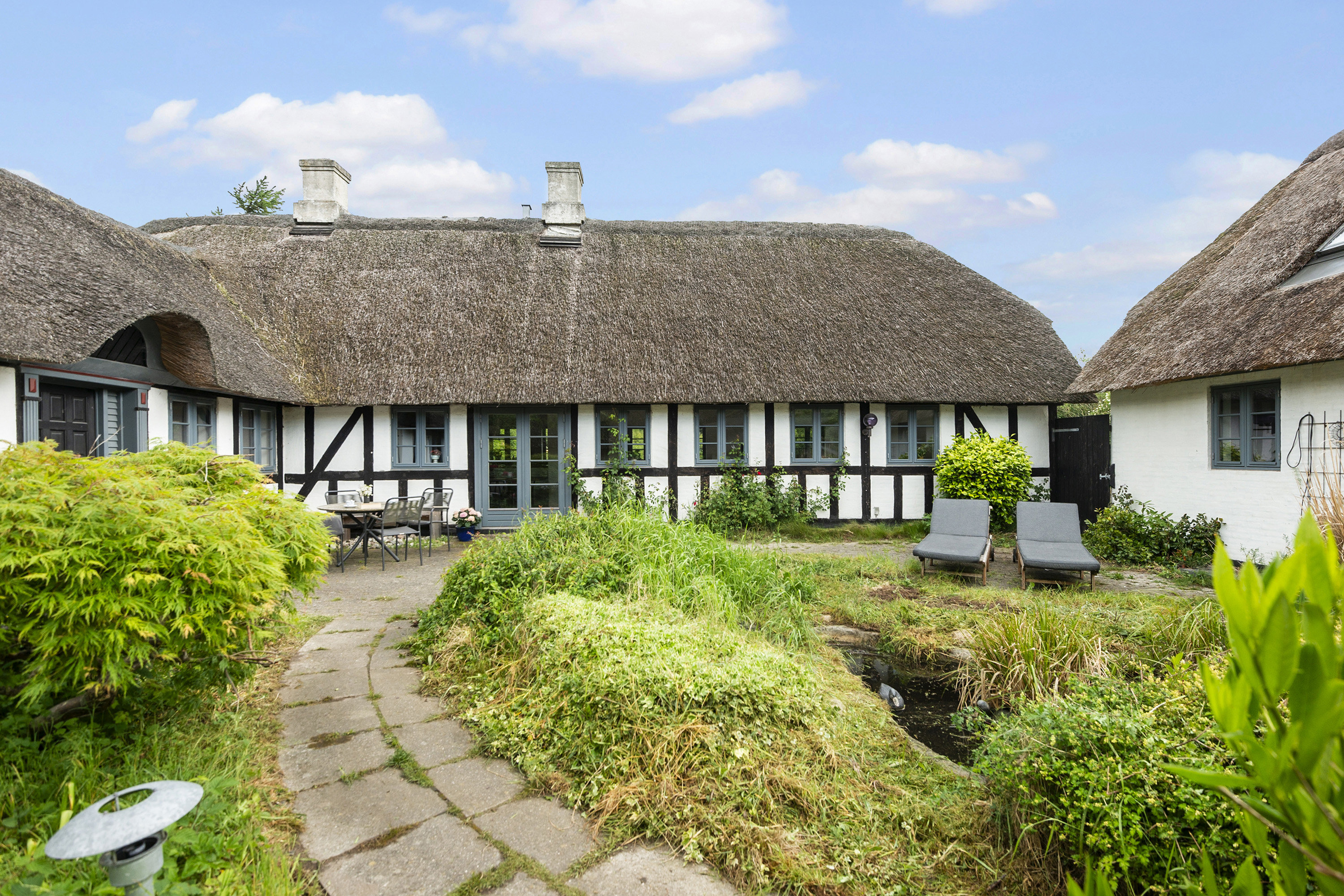Den trelængede ejendom har en lang historie, der går tilbage til 1749, og den består af et rummeligt boligareal på 215 kvadratmeter udover en stor garage og en nyrenoveret tilbygning fra 2007.