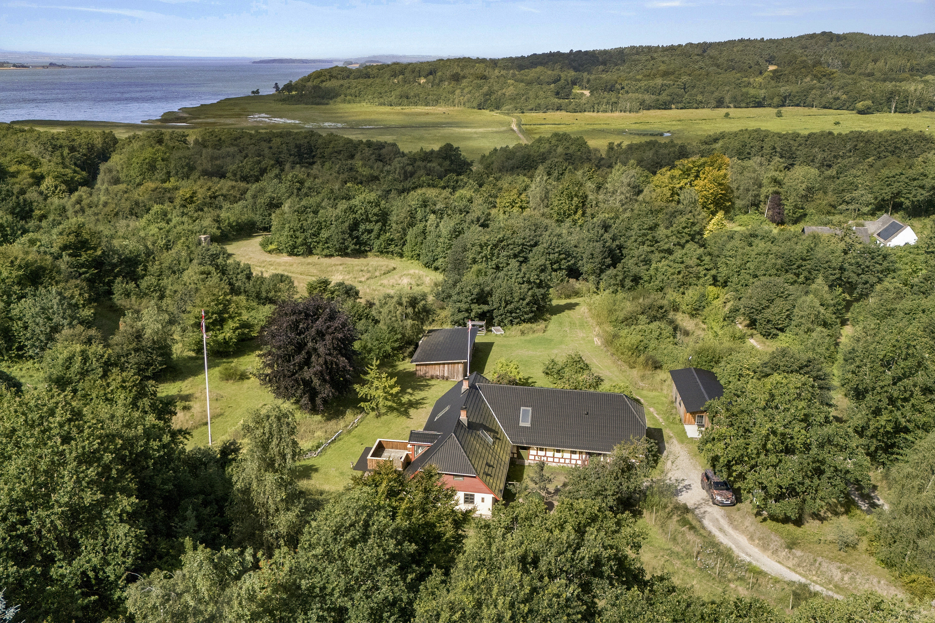 Grunden er smukt anlagt med gamle frugttræer og en frodig have, der glider naturligt over i den omgivende skov. Foruden hovedhuset får I også et nyopført, isoleret udhus på 30 m², som nemt kan omdannes til anneks. Derudover findes et 72 m² stort udhus opdelt i tre separate rum – to lukkede og et åbent. I hovedhuset er der også et stort værksted.