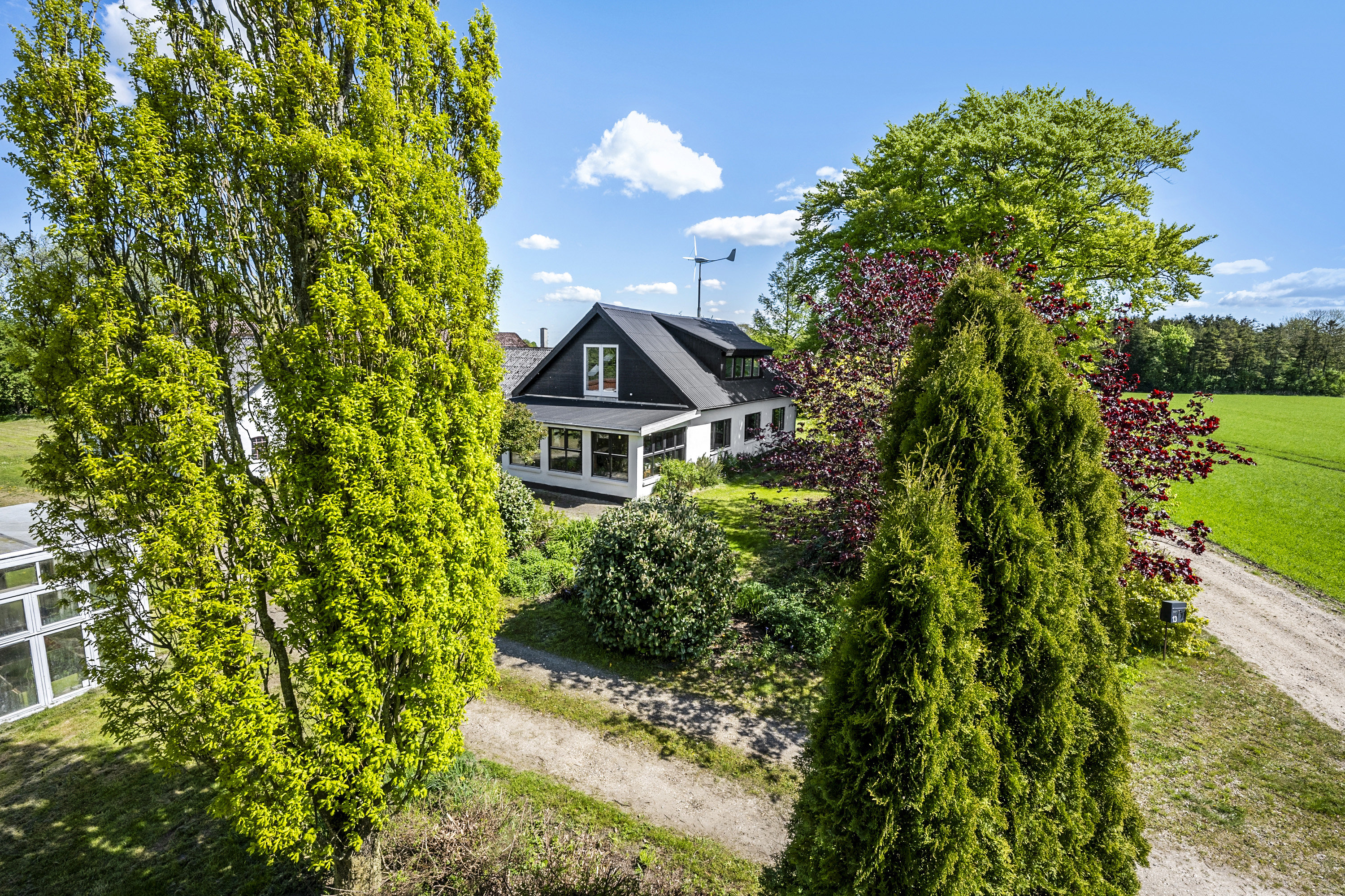 Som prikken over i’et følger en 6 kW vindmølle, der kan levere grøn strøm til ejendommen og el-bilen.