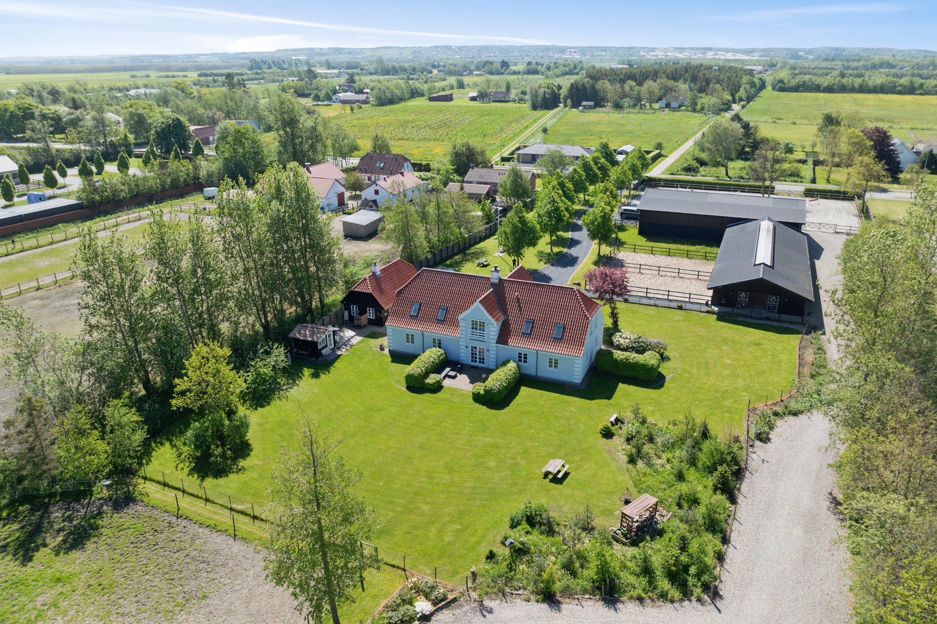 Den lange indkørsel prydes af træer på begge sider og leder op til en prægtig ejendom. Huset placerer sig på en pragtfuld stor grund, der byder på endeløse muligheder. De mange kvadratmeter er hjemsted for nogle gode og flotte udbygninger - herunder ny staldbygning fra 2018 på 300 kvm samt en nyere anlagt ridebane (der opfylder alle krav), og der er i det hele taget ideelle betingelser for at holde heste på matriklen. Med tusindvis af grønne kvadratmeter har I også masser af plads til hyggelige stunder under åben himmel, ligesom I forsynes med flere dejlige terrasser.
