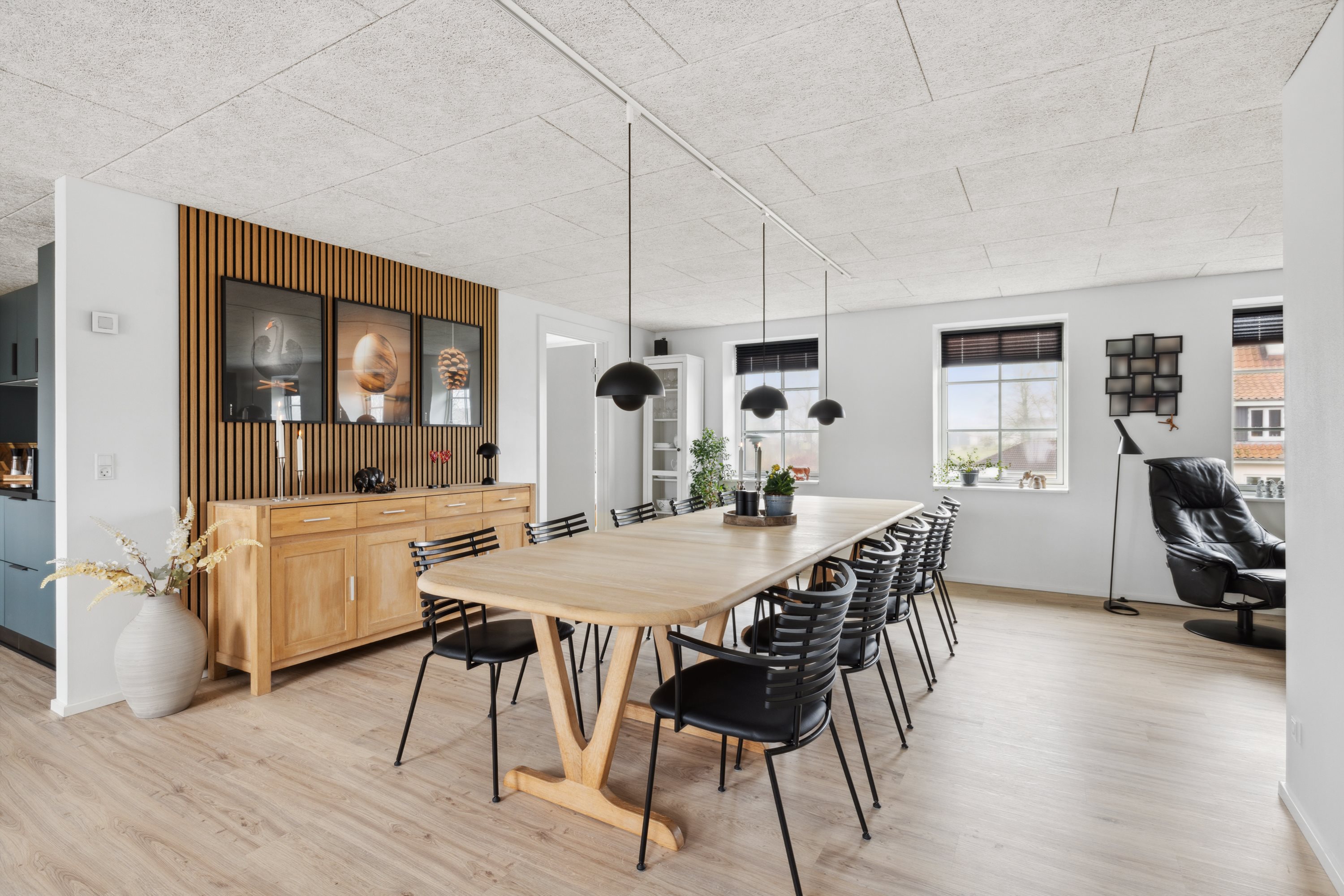 Tre værelser, et bryggers, et stort badeværelse og slutteligt et skøn opholdsrum, der forener køkken, alrum og stue, fordeles på stueetagen, og dertil kommer et stort loftrum. Alle 177 boligkvadratmeter er ganske nydelige, og I kommer til at bevæge jer rundt i flotte omgivelser under Troldtekt-lofter udstyret med spots. Designa lægger navn til det stilfulde inventar i såvel køkkenet som i bryggerset og på badeværelset, og de indvendige døre fra Swedoor er massive. Der er både Quooker og vinkøleskab i køkkenet, og hele vejen igennem er der kræset for detaljen!
