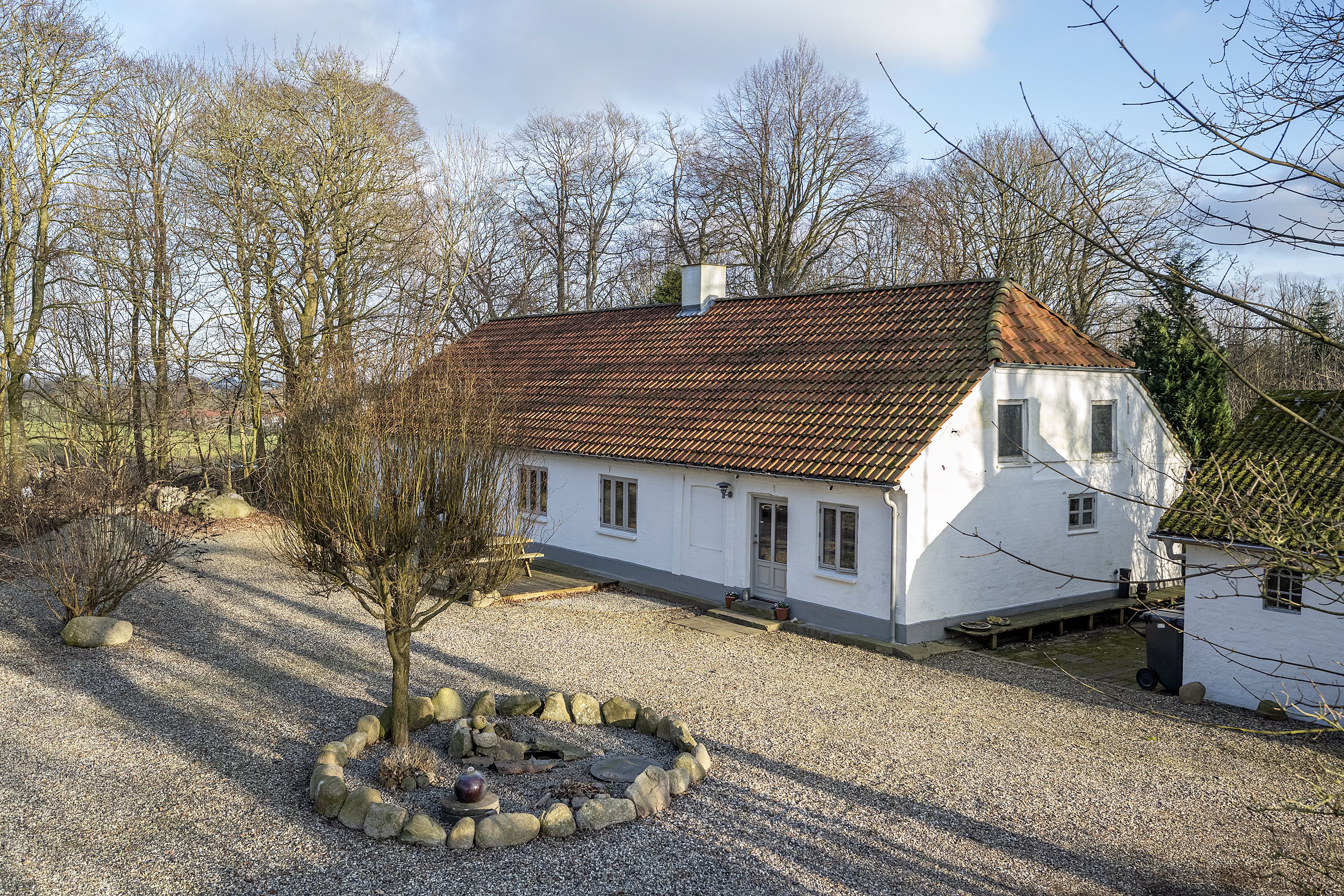 Kort fortalt er dette en ejendom, hvor naturen danner maleriske rammer om en rolig dagligdag. Grunden er på næsten én hektar, og den er omgivet af store, gamle træer med masser af biodiversitet – og deraf et rigt fugle- og dyreliv. Udover stuehuset er der et stort udhus med bl.a. fyrrum/værksted og en cirka 70 m2 stort carport. Gårdspladsen er belagt med perlegrus.