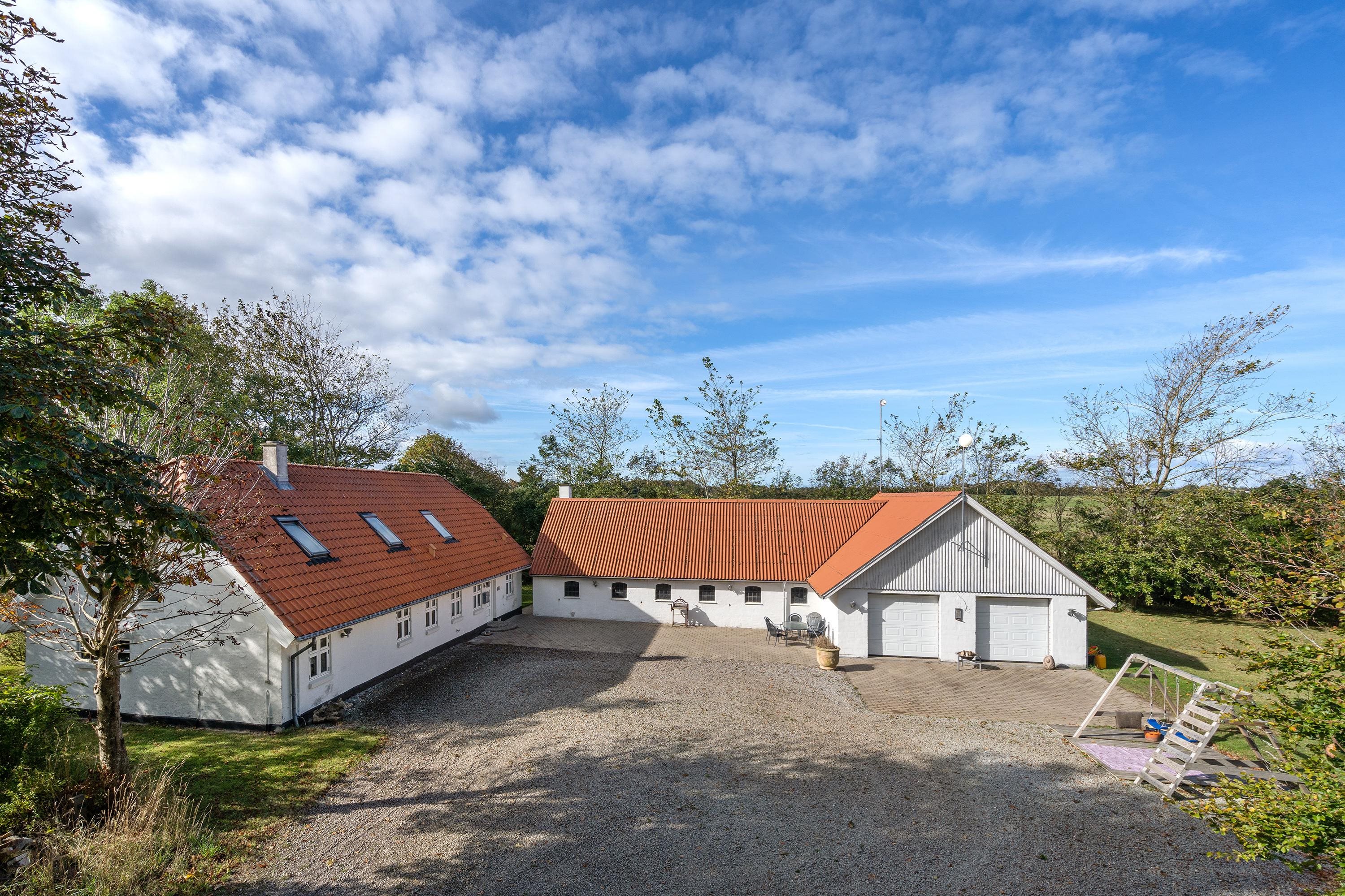 Via en privat grusvej ankommer I til denne store ejendom med et stort stuehus, som med sine 173 kvm. rummer plads til den store børnefamilie. Dertil kommer en stald/gildesal på 101 kvm. samt en dobbelt garage med to porte.
