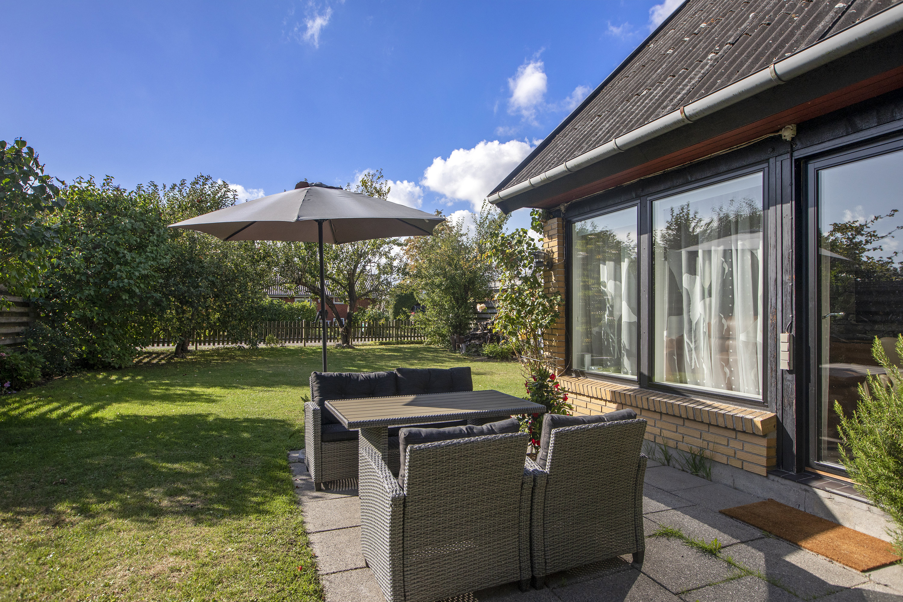 Udenfor venter en stor, sydvendt have, hvor solen kan nydes hele dagen. Her er rig mulighed for at skabe et skønt uderum med terrasse, legeplads eller køkkenhave – alt efter behov.