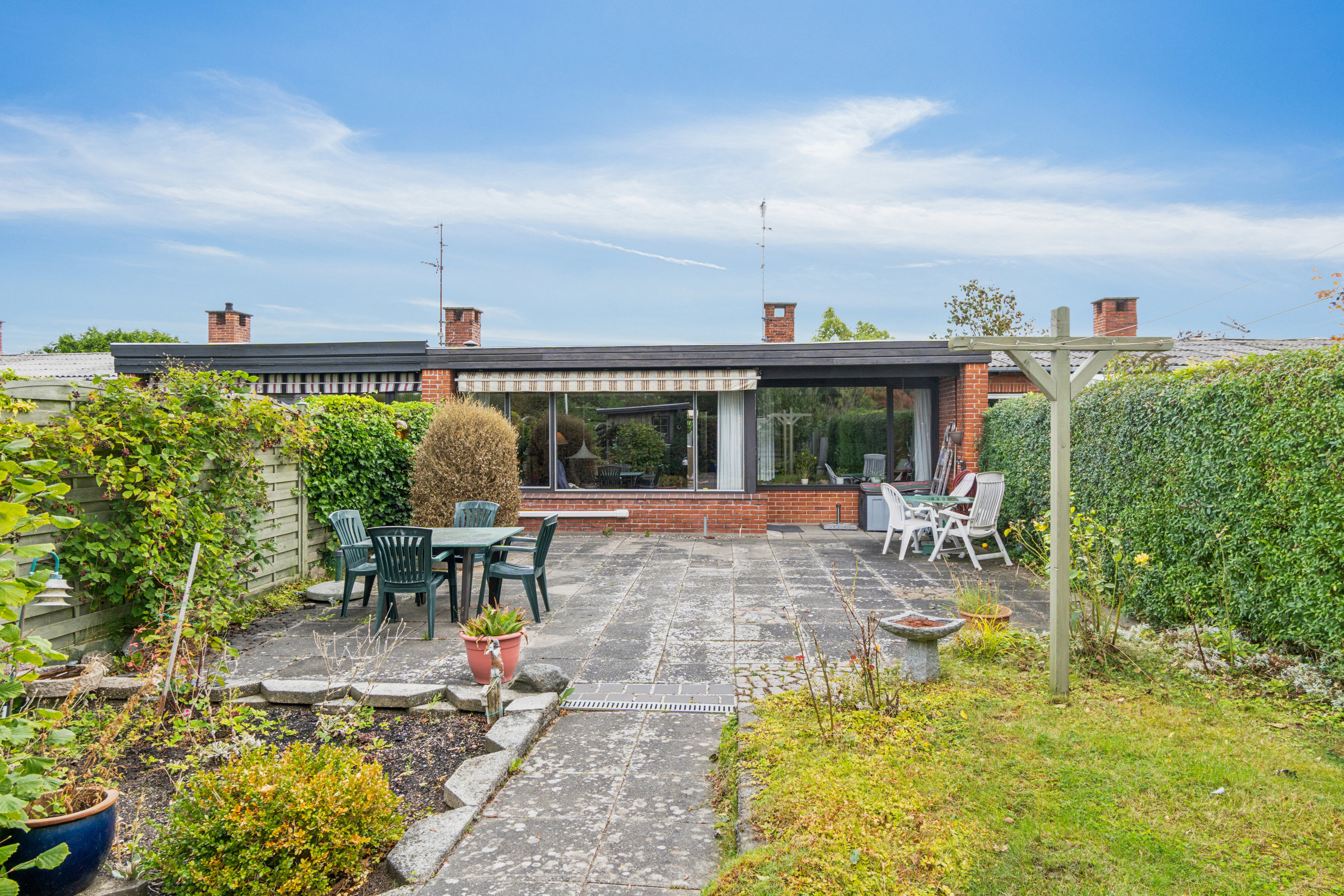 Fra stuen er der udgang til den vestvendte baghave, og her får I en stor fliseterrasse, grønne bede og et mindre græsareal. Der er også et praktisk skur og et drivhus.