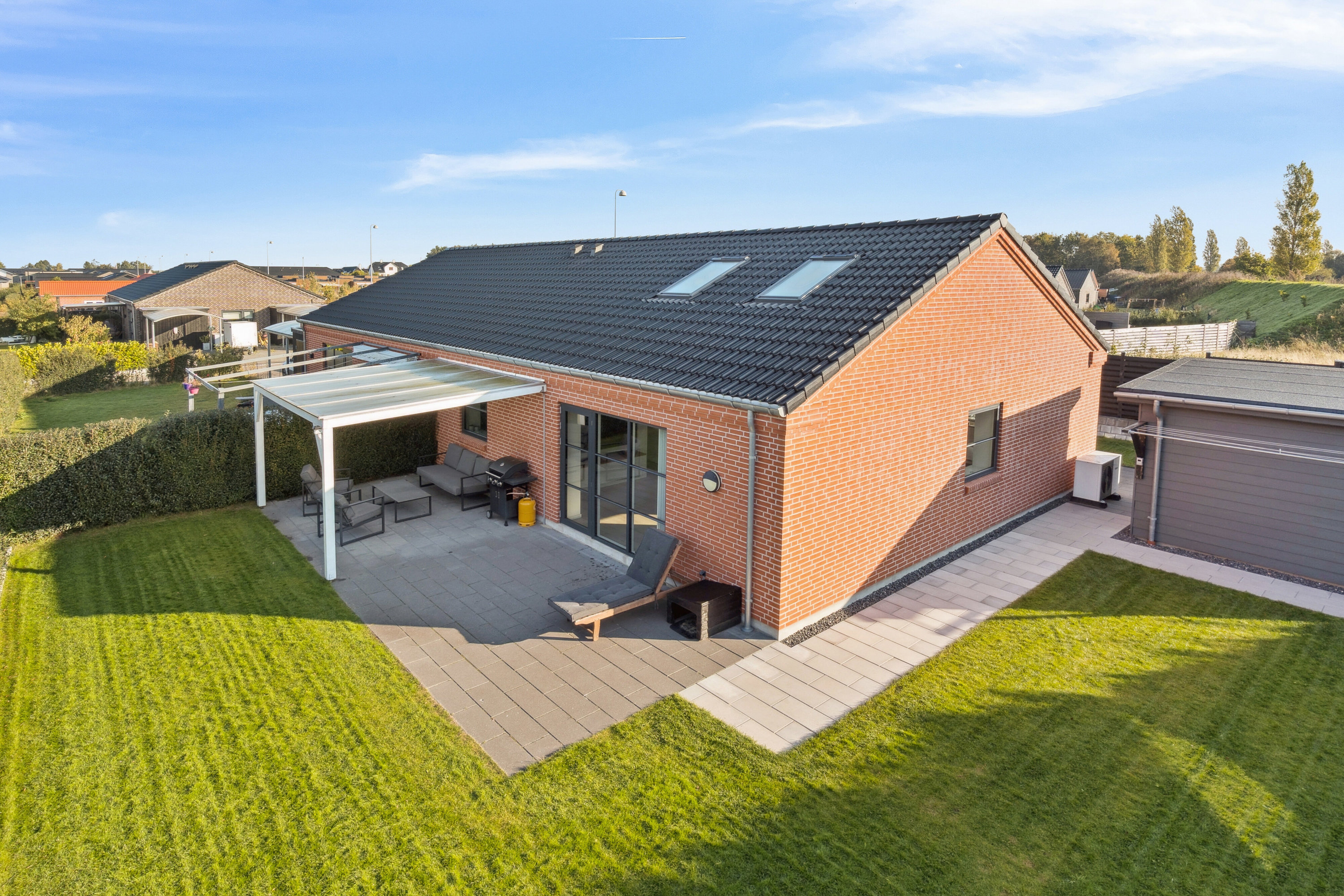 Haven er nem at passe, og terrassen er overdækket. Sol er der desuden masser af, mens det hele afrundes af et fantastisk skur. Det er opvarmet, så det kan bruges til et utal af forskellige formål.