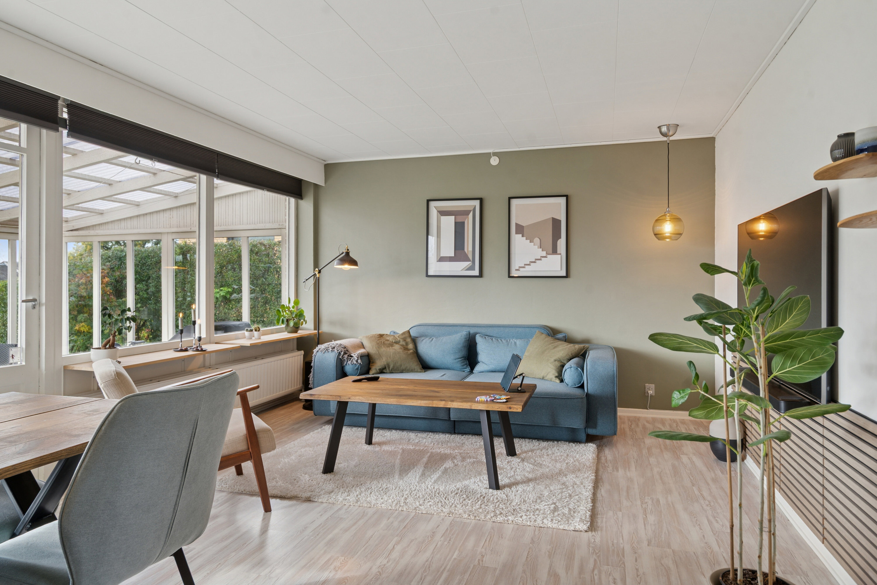 Her strømmer lyset ind, og fra stuen er der direkte udgang til en dejlig, overdækket terrasse – perfekt til sommeraftener og hyggelige stunder i læ.