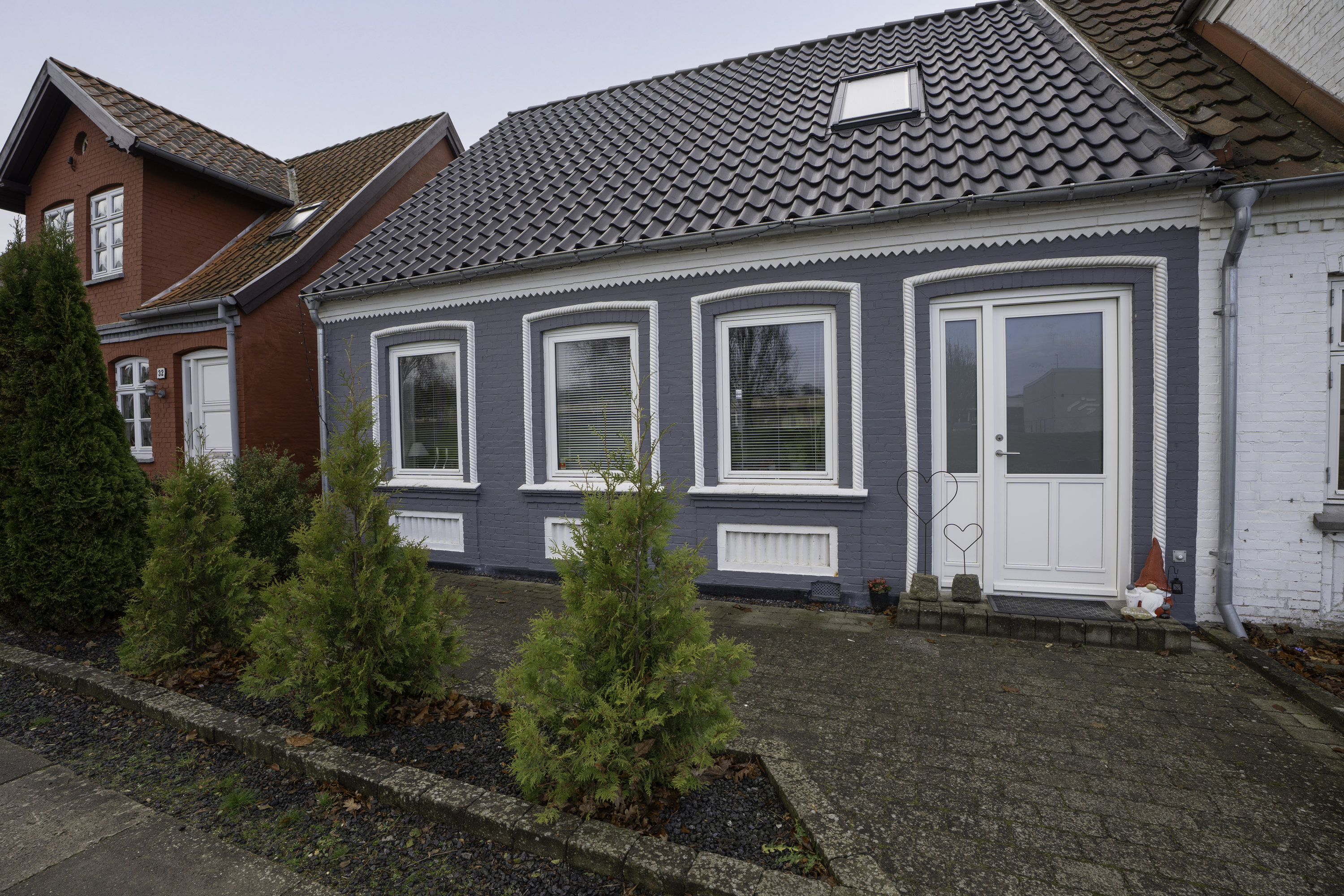 Huset ligger på en nem 195 m² grund i et eftertragtet område af byen, hvor den grå facade med hvide vinduer byder jer velkommen med et lyst og indbydende udtryk.