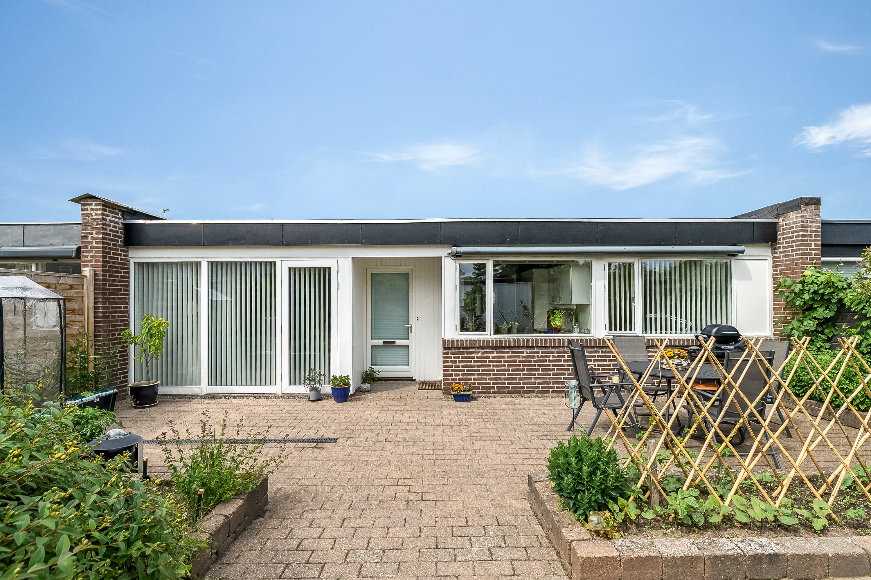 Indendørs venter et dejligt lyst og velindrettet hjem med plads til familielivet og gode venners lag. I får et skønt opholdsmiljø, hvor køkken, alrum og stuer flyder sammen på fineste vis i en rumfordeling, der skaber stor fleksibilitet i hverdagen. Køkkenet er velindrettet og nyrenoveret, mens stuerne byder på nydelige trægulve i ask og fine lysindfald. Fra opholdsmiljøet er der udgang til skønne terrasser og grønne oaser på begge sider af boligen.