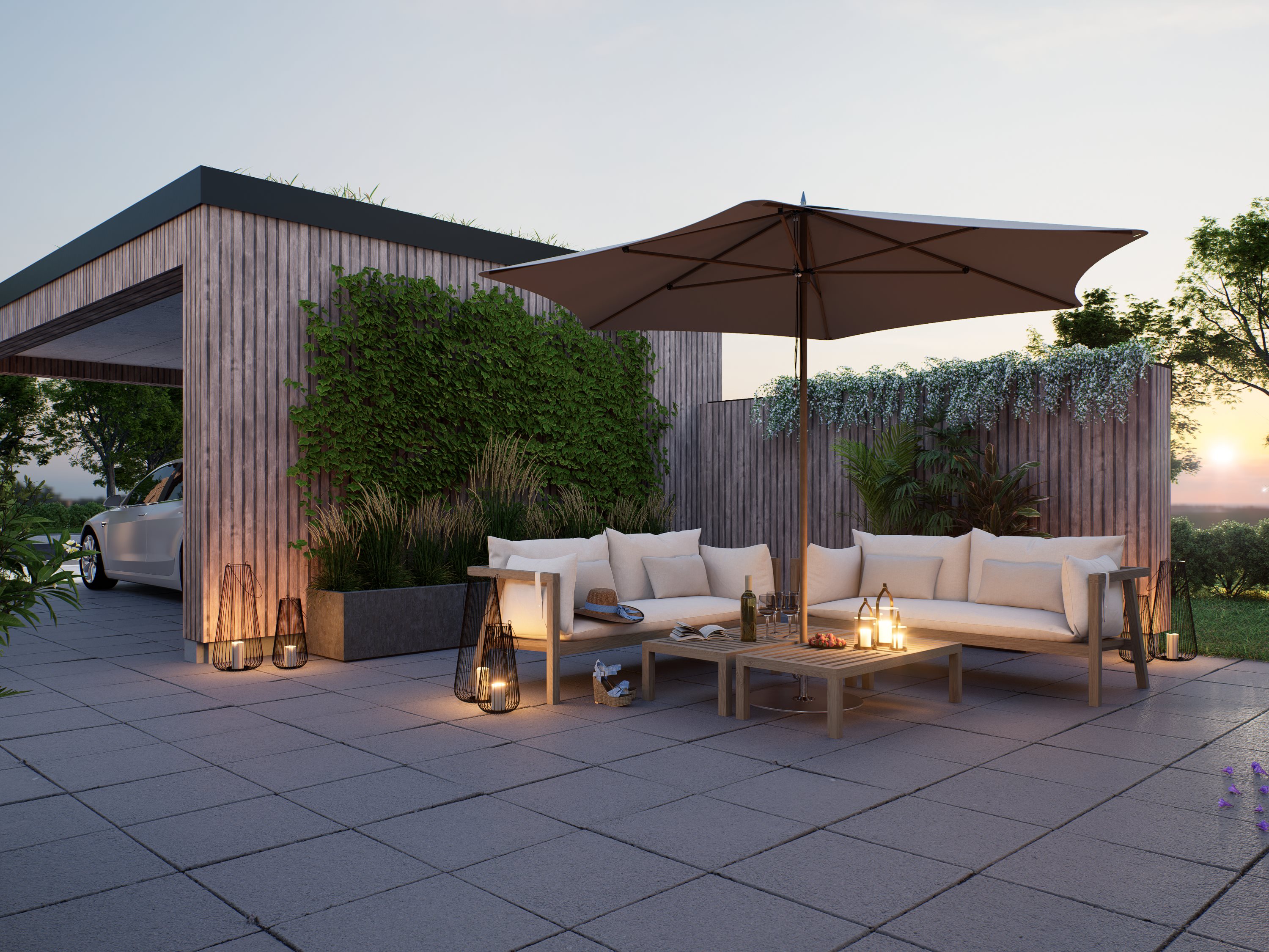 Boligen opføres med en praktisk carport, der beskytter bilen mod vejrets påvirkninger, samt et separat skur, ideelt til opbevaring af haveredskaber, cykler eller andre nødvendigheder. Den nemme grund er designet med fokus på minimal vedligeholdelse, så du kan bruge din tid på det, der virkelig betyder noget, i stedet for at bekymre dig om havearbejde.