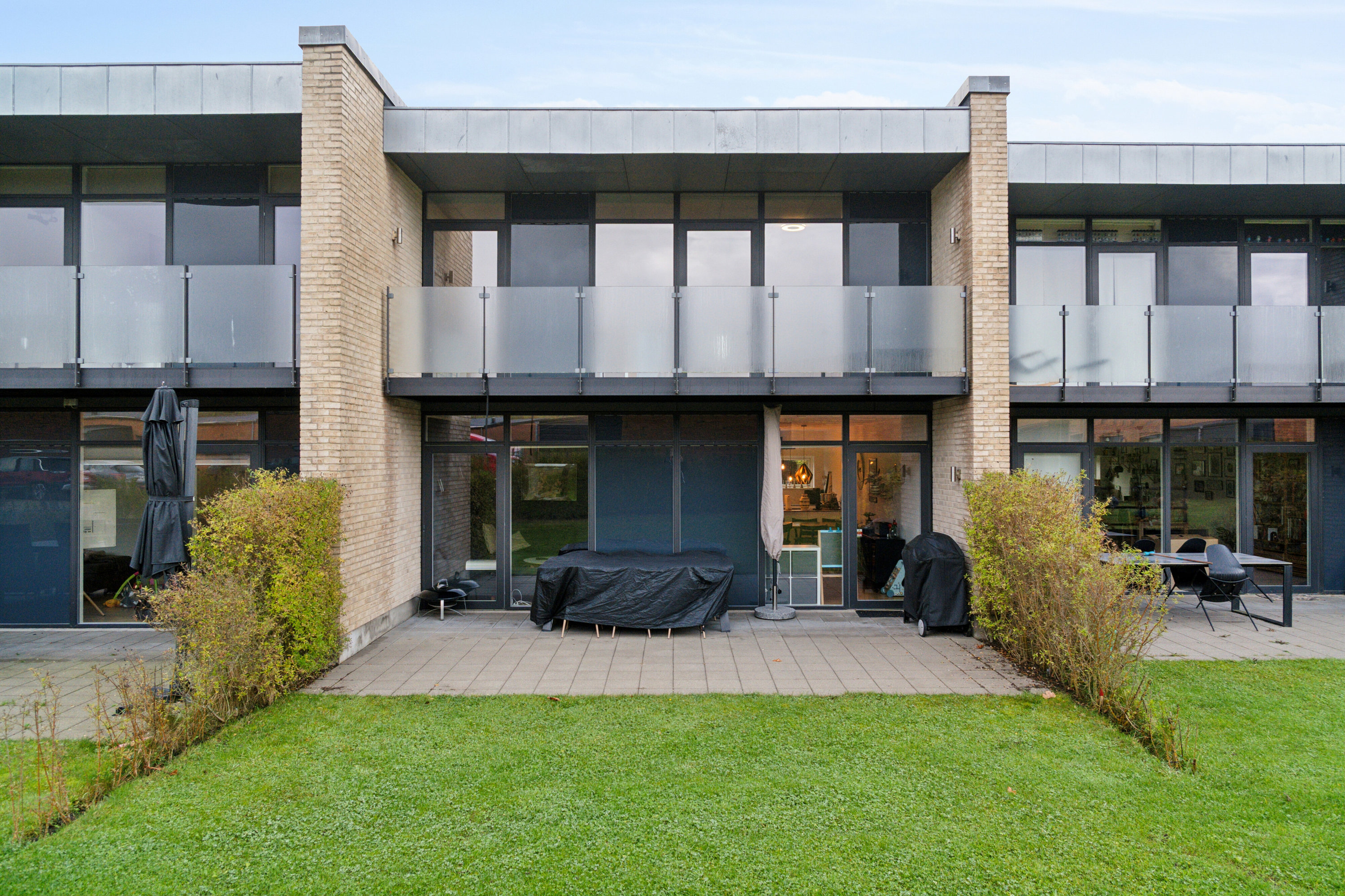 Til rækkehuset er en lille have bag ejendommen, der er anlagt med fliseterrasse og græs. Foran ejendommen er et aflukket fliseareal og plads til to biler, den ene kan stå i carporten, hvortil der også er et godt skur.