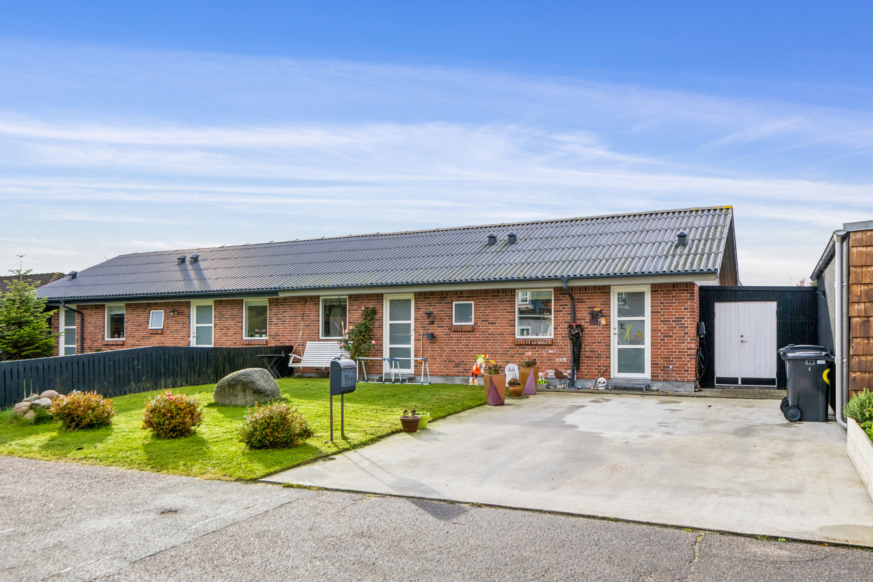 Et rigt udeliv. Det venter en indbydende ankomst, når røde sten, hvidrammede vinduer og en fin, grøn forhave tager imod jer på adressen. Rækkehuset har egen indkørsel og et skur til alt det praktiske, mens der på den anden side venter en skøn og dejligt solrig have. Her er plads til både leg og hobbyprojekter, grillaftener og komplet afslapning på henholdsvis græs og den lækre træterrasse, hvoraf en del tilmed er pakket ind foroven og på siderne, så der opstår et hyggeligt lille uderum.