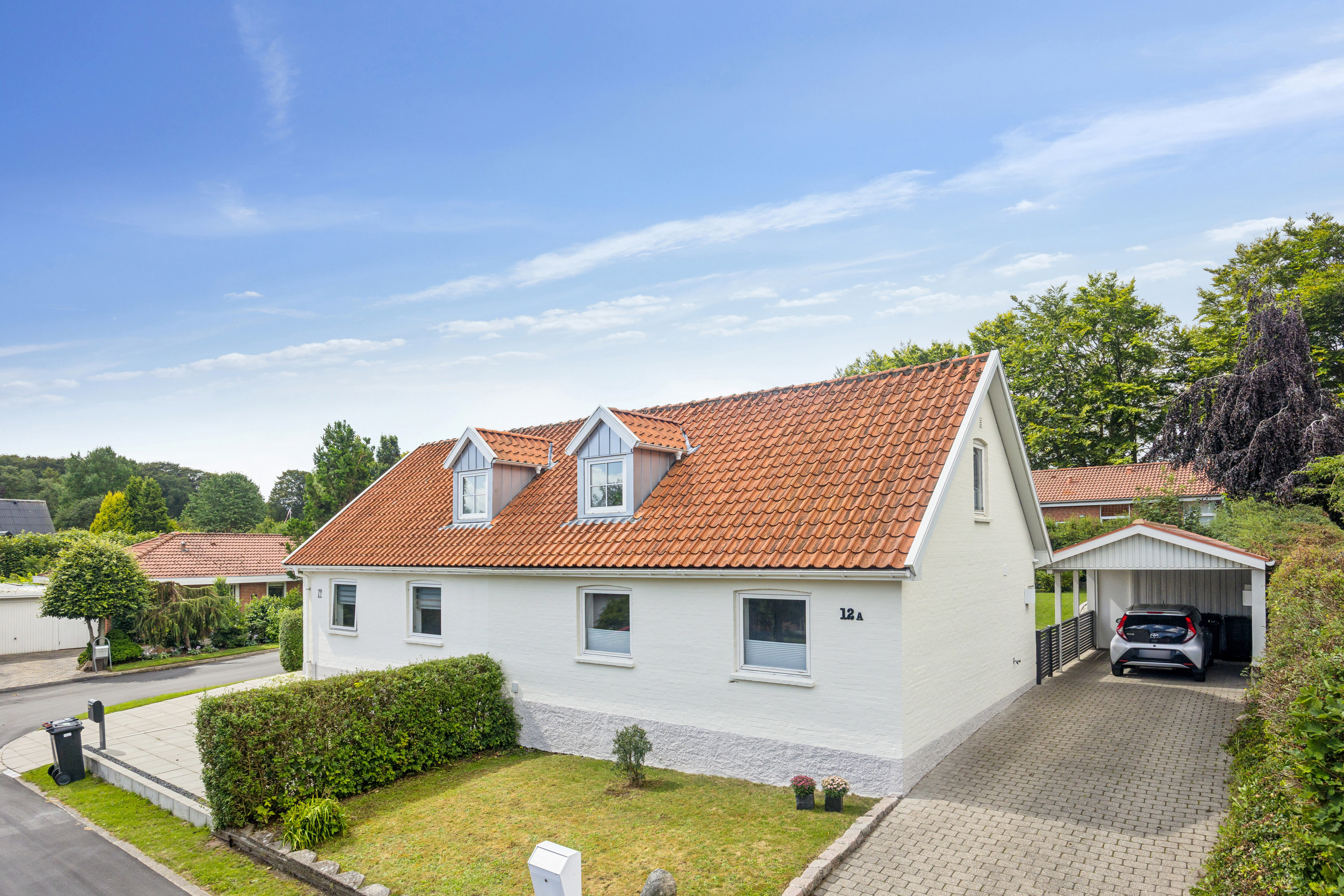 Velbeliggende på en blind vej. Den trygge vej emmer af ro. Herfra ledes I via en indkørsel forbi den fine forhave, der gør et godt førstehåndsindtryk, og videre op til carporten, hvor lågen åbner ind til baghaven og husets indgang. Her orienterer en terrasse sig dejligt mod vest, mens en hyggelig, nem og afskærmet have strækker sig ud i forlængelse af de solvarme fliser. Med et par praktiske udhuse ved hånden kan I desuden nemt gemme legetøj og haveredskaber af vejen.