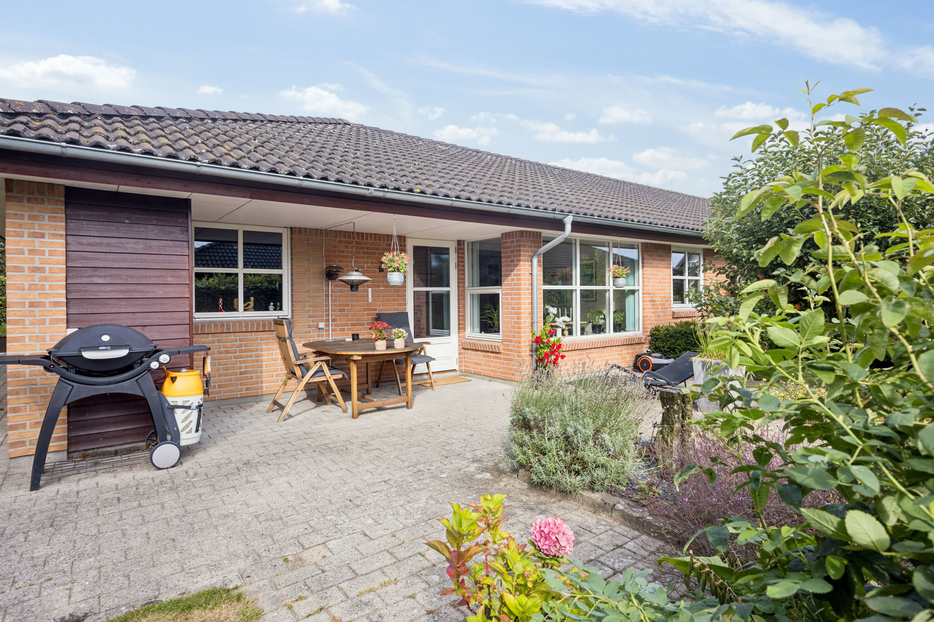 Rækkehuset fra 2004 byder på velholdt charme med sine røde mursten og carport. Foran huset finder I en delvist overdækket terrasse, mens baghaven folder sig ud mod syd med endnu en fliseterrasse, nem plæne, farverige bede og et æbletræ, hvis frugter lover søde smagsprøver i sensommeren. Haven er privat og afskærmet af høj hæk, og terrassens delvise overdæk sikrer, at også lunefulde dage kan nydes udendørs. Til ejendommen hører desuden tre skure.