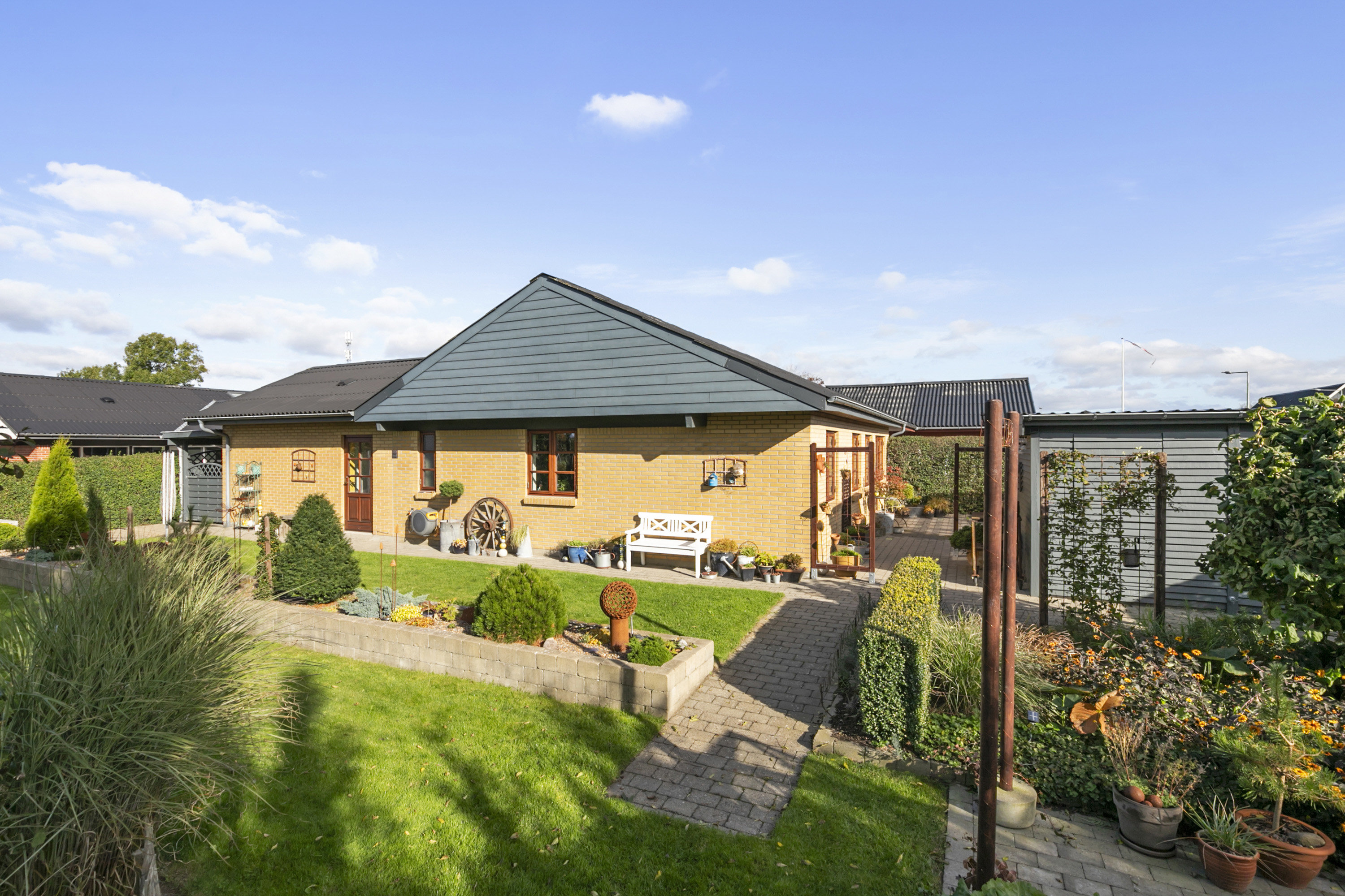 Rækkehus på 115 m² med 4 værelser og 1 bad fordeler sig praktisk på én etage i en velholdt ramme fra 1978, moderniseret i 2002. Ved ankomsten møder du den gule murstensfacade, trævinduer og en beskyttet indkørsel med carport. Indgangen ligger i en lille, privat flisegård, som sammen med huset signalerer en gennemført og pæn standard — et hjem der umiddelbart fremstår indbydende og overskueligt i hverdagen.Boligen byder på et lyst, åbent opholdsrum i forbindelse med køkkenet, hvor store vinduer lukker dagslyset effektivt ind. Køkkenet er indrettet med hvide skabsløsninger og træbordplader samt et ternet gulv, der giver karakter og funktionalitet. Fra entréen er der adgang til bryggers, praktisk opbevaring og de tre værelser, som sammen med stuen skaber fleksible rammer til både familieliv og hjemmearbejde. Badeværelset er holdt i neutrale materialer med bruseniche og god skabsplads.Haven og udearealerne er et tydeligt salgsargument; den samlede grund på 678 m² rummer både en velanlagt plæne og flere flisearealer, der er nemme at vedligeholde. Der er et stort, overdækket terrasseområde med pergola og transparent tag, som inviterer til udendørs spisning uanset vejr. Morgenkaffen på terrassen bliver hurtigt dagens bedste øjeblik. Endvidere findes udhus, lille drivhus og afskærmede opholdsrum, der giver privatliv og muliggør flere udendørszoner.Beliggenheden i et roligt villakvarter giver ro til familien samtidig med nem adgang til lokale faciliteter. Området har indkøbsmuligheder, skole og daginstitutioner inden for kort pendlerafstand, og hovedveje samt lokale stinetværk gør det enkelt at komme rundt i bil og på cykel. Parkering er løst med carport og gæsteplads ved indkørslen, så hverdagen bliver ukompliceret for både pendlere og børnefamilier.Samlet får du et velholdt rækkehus med gennemtænkte udearealer, god planløsning og praktiske rum til dagligdags brug. De indvendige flader og det overdækkede terrassemiljø gør boligen klar til overtagelse, samtidig med at mulighederne for personlig tilretning er til stede. Kontakt os for en fremvisning og oplev, hvordan denne bolig kan danne rammen om jeres næste kapitel.