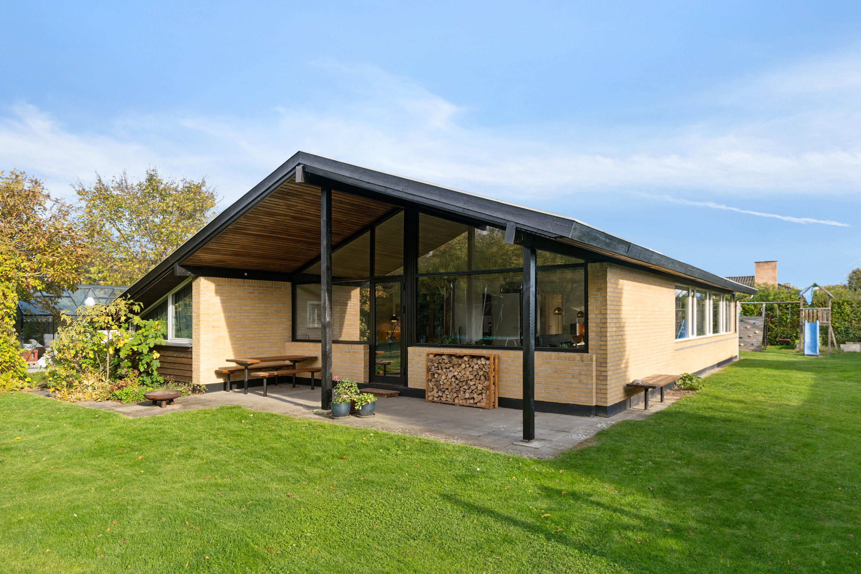 Villaen på 138 m² ligger på en privat grund på 1.135 m² og byder ved ankomst på en tydelig arkitektur med store glaspartier under saddeltaget. Fra indkørslen og carporten træder I ind i et hjem hvor dagslyset spiller gennem den høje glasgavl og møder trælofterne — et førsteindtryk af rummelighed og kontakt til haven, der inviterer til udendørsliv og familierutiner.Planløsningen samler ophold og køkken i et stort alrum, hvor den markante glasvæg åbner direkte mod terrassen. Gulvene er lyse træparketgulve, og brændeovnen skaber et samlingspunkt i stuen. Køkkenet ligger i tilknytning til alrummet og har praktisk forbindelse til bryggerset, der rummer vaskefaciliteter og udgang til haven. Entré og gang fordeler husets værelser og sørger for en funktionel hverdag.Boligen rummer i alt fire soveværelser og et ekstra disponibelt rum, som kan bruges til kontor eller hobby. Badeværelset er centralt placeret samt separat gæstetoilet, hvilket gør huset velegnet til en familie. De mange vinduer mod haven giver godt lys i alle rum og skaber visuel kontakt til de grønne arealer — samtidig er der opbevaringsmuligheder i skabsnicher og i bryggerset.Udenfor finder I en stor, delvist overdækket terrasse, som er velegnet til morgenkaffen og længere middage på varme aftener. Grunden er nem at holde med plænearealer, afgrænsende hække og plads til både legeredskaber og redskabsskur. Fra indkørslen er der nem adgang til carport, og der er gode muligheder for parkering til gæster på flisebelægningen.Ejendommen ligger i et roligt villakvarter med kort køreafstand til lokale indkøb, daginstitutioner og skole samt til offentlig transport. For jer der søger en familievenlig bolig med rummelige opholdsarealer, direkte havekontakt og praktiske løsninger, er dette et klart bud. Kontakt os gerne for en fremvisning og oplev huset og haven på tæt hold.