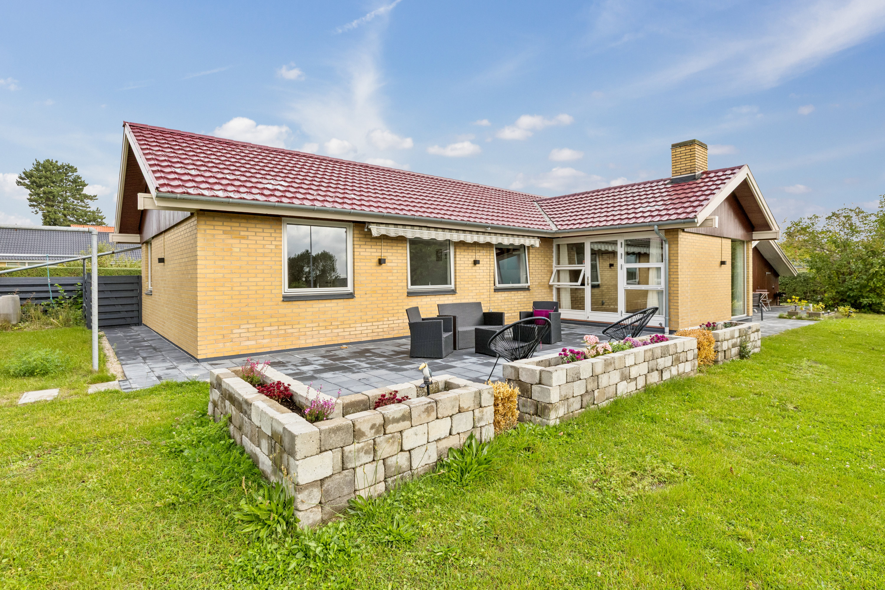 Terrassen vender mod sydvest, hvor de bedste soltimer venter, og rundt om de lune fliser breder en skøn have med frugttræer og hæk omkring sig med masser af plads til leg og rekreative stunder på den 1.067 kvadratmeter store grund.