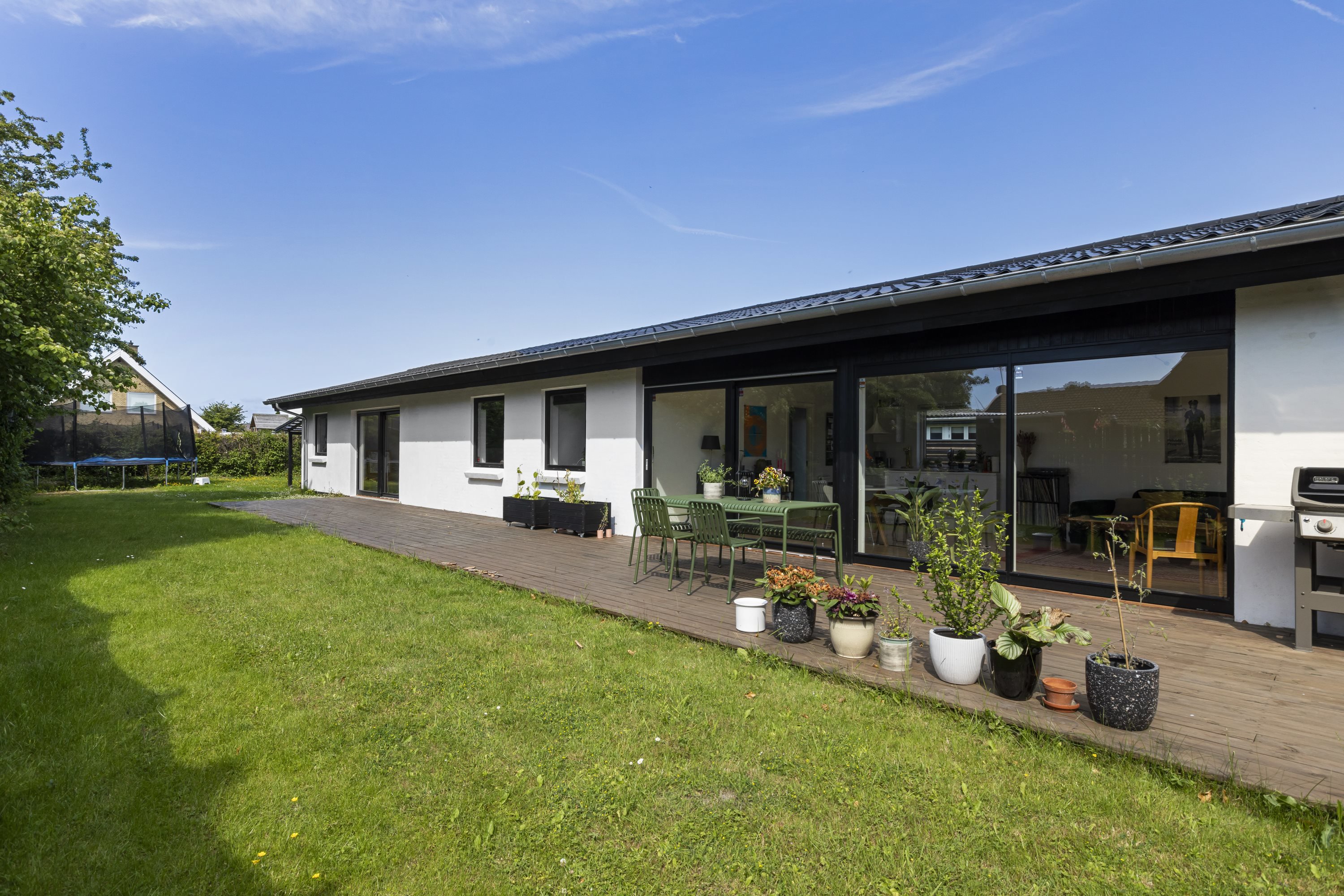 Udenfor venter en overskuelig have, hvor både børn og voksne kan nyde livet. Her er en solrig terrasse, perfekt til grill og hygge, samt carport og opbevaringsmuligheder.