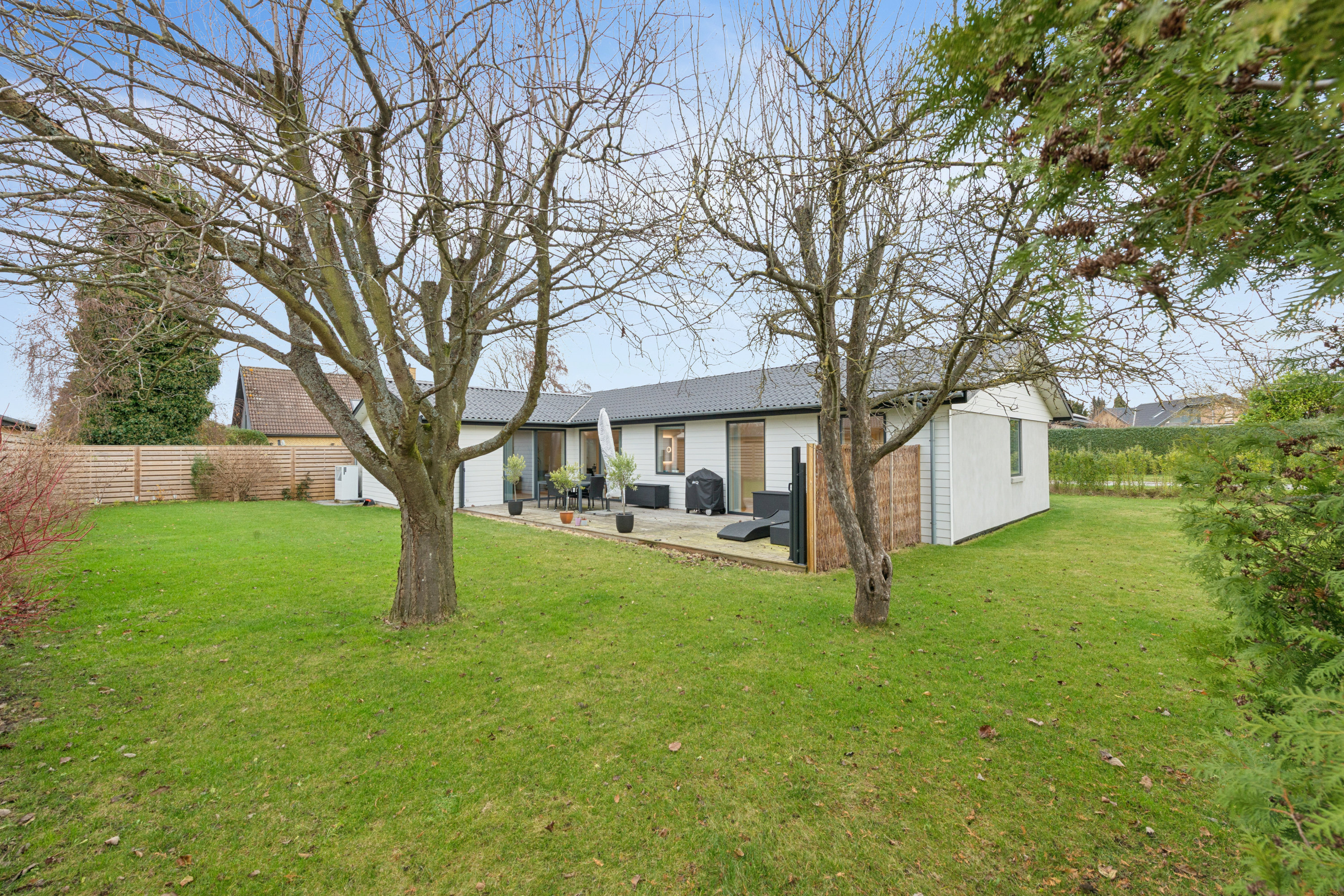 - Lækker træterrasse i en grøn, nem og solrig have