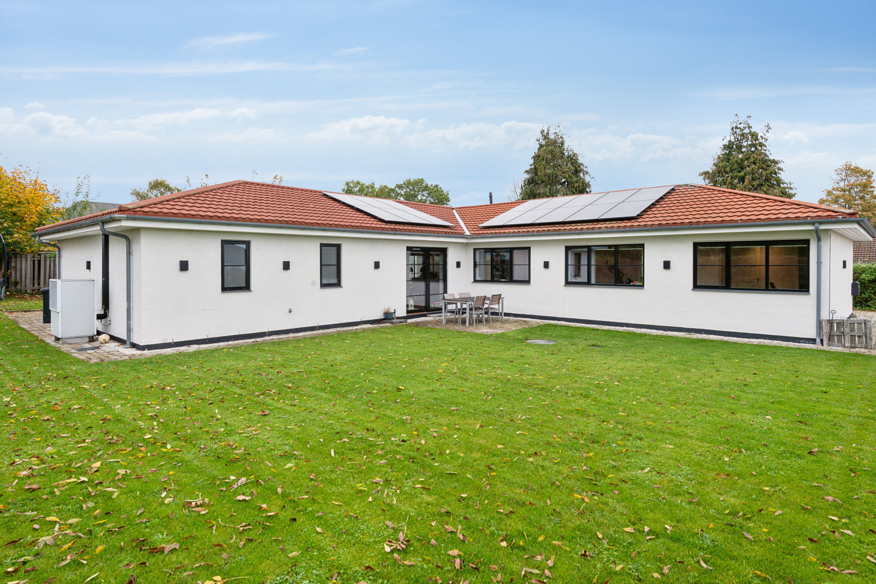 Stor og flot renoveret villa med perfekte betingelser for at være selvforsynende Rene linjer og moderne faciliteter fordeler sig ud over ét plan. Her går æstetik og praktik op i en højere enhed, for udover at præsentere sig utrolig indbydende byder ejendommen på alt fra solcelleanlæg til genanvendelse af regnvand. Indretningen består af fem værelser, to badeværelser og et gæstetoilet samt ikke mindst et lækkert køkken-alrum i åben forbindelse til stuen. Flere steder i hjemmet kan I åbne ud til terrasserne og haven, og så er beliggenheden attraktiv –tæt på alt i et trygt og roligt kvarter.