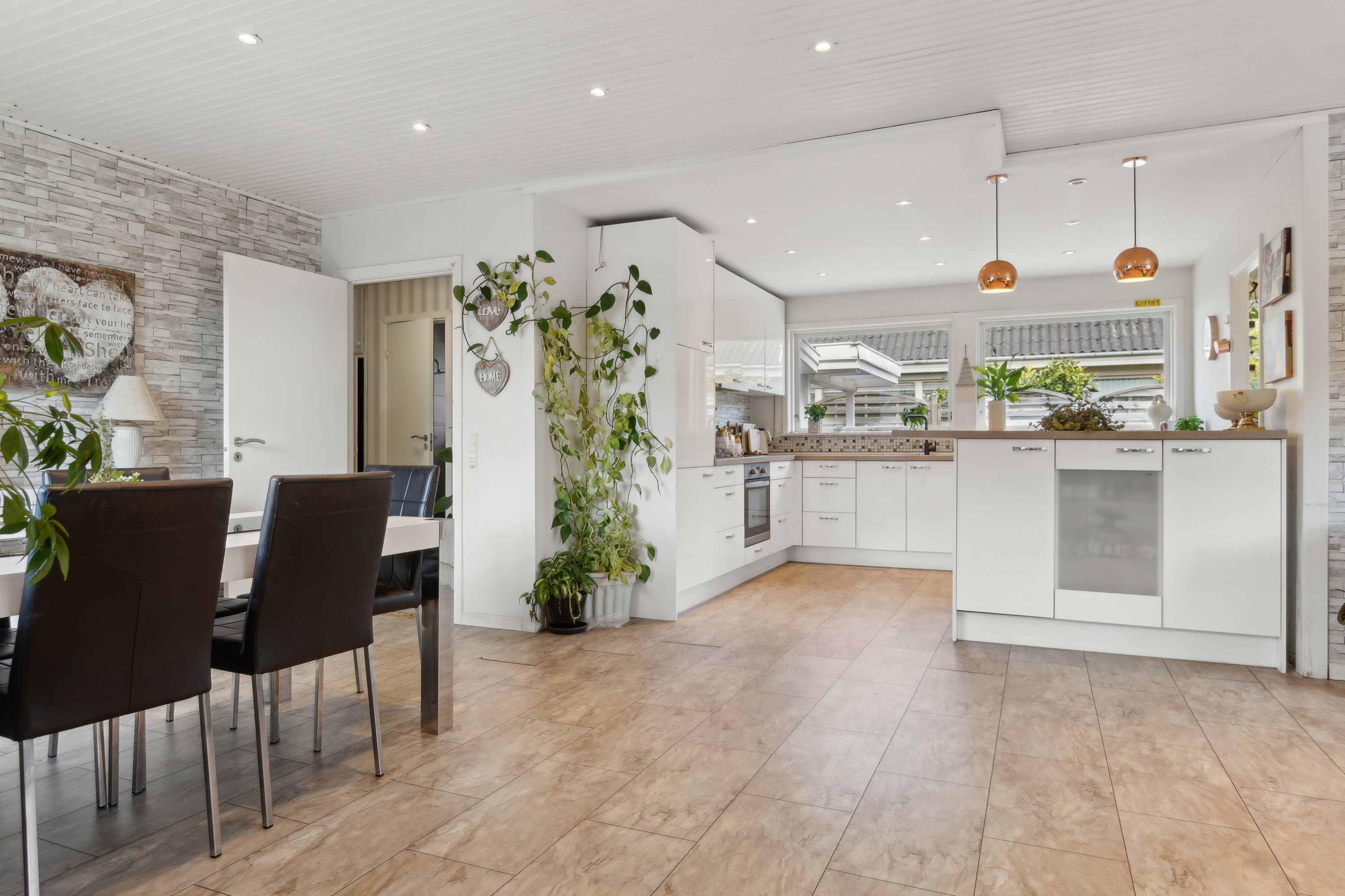 Dels den sociale arena, der formes af et åbent rumforløb med køkken og to stuer. Det stilrene køkken er oppe i en god familiestørrelse. Stuerne rummer gerne spisebord og en stor sofaafdeling. Såvel køkken som stuer er udstyret med loftspots, der tager hyggeligt over, når dagens naturlige lysindfald fra tre verdenshjørner er på pause. Køkkenet er nabo til hjemmets bryggers med vaskefaciliteter og egen indgang. Stuerne har tæt kontakt til et ekstrarum, der kan fungere som kontor, gæsteafdeling eller som en udvidelse af stueafdelingen.