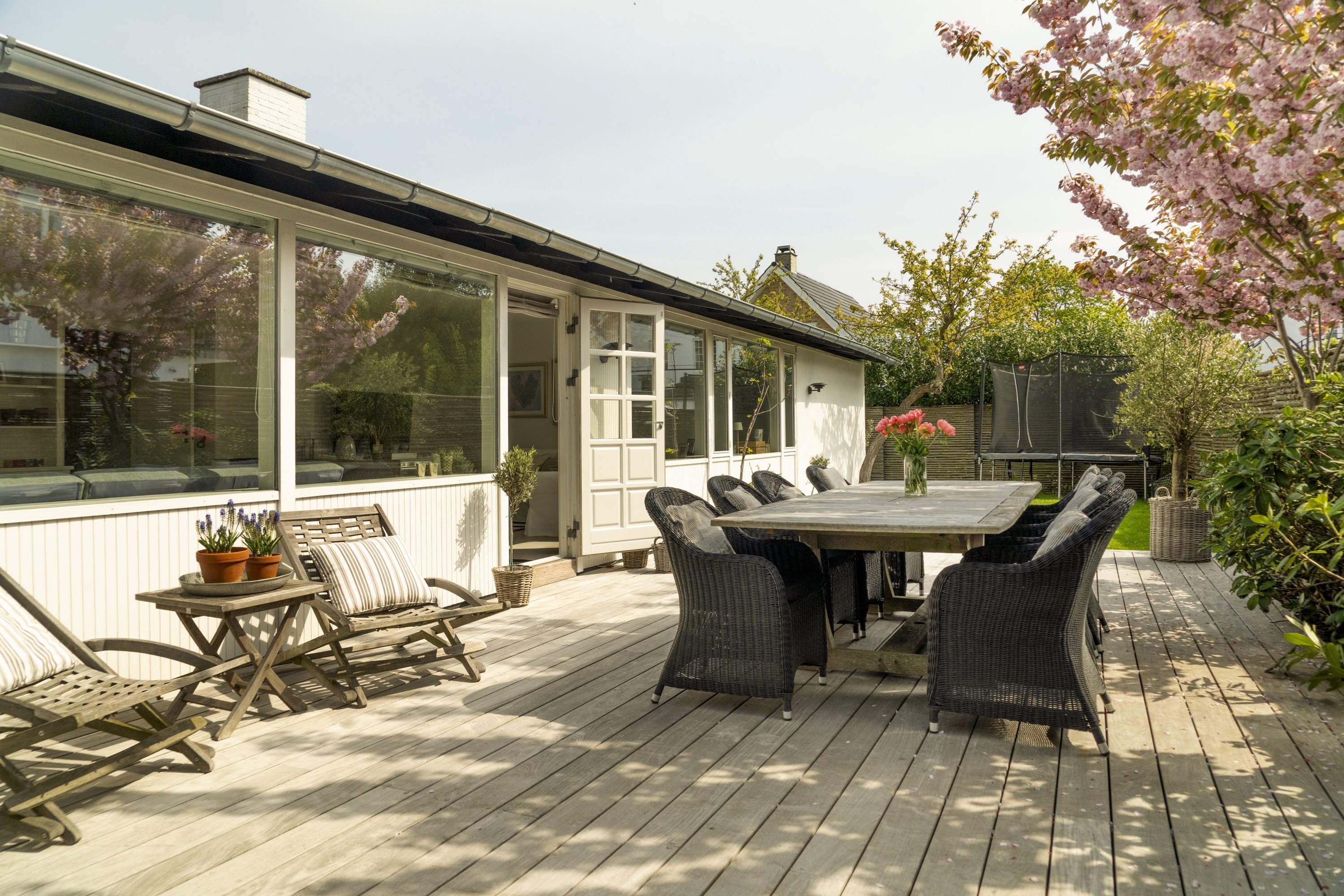 Haven er smukt anlagt og meget privat med hele tre terrasser, så solen kan nydes på alle tider af døgnet. Den er skærmet fra vejen og skaber en ugeneret og afslappende atmosfære.