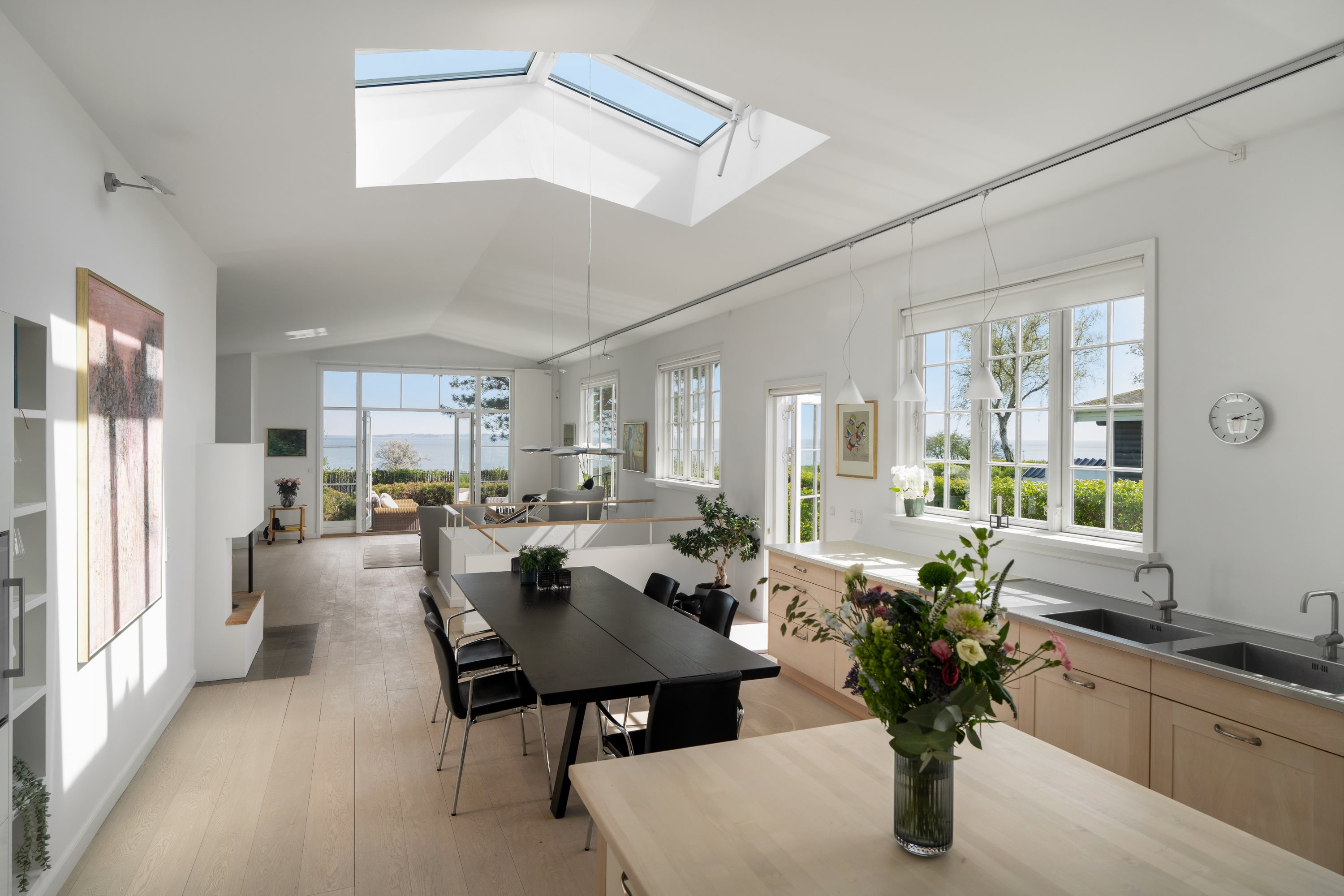 Træd ind ad den flotte røde trædør ind i den rummelige entré. Her ligger et dejligt badeværelse og indgang til fredelig værelsesafdeling med skabsgang, badeværelse og soveværelse med fløjdøre ud til hyggelig brostensbelagt terrasse med udendørsbruser. Fra entréen kommer du til husets store, indbydende køkken/alrum med loft til kip, dejligt ovenlysvindue og en skøn, åbne pejs, der sørger for stemning og ekstra lune på de kølige dage. På den sydvendte træterrasse udenfor køkkenet kan du sidde ude selv i regnvejr under den store markise og nyde udsigten til Øresund. Måske Humlebæks hyggeligste plads til solbadning og grillhygge. Fra alrummet er der trappe til det nedre plan, som deler rummet fint op, så den skønne stue for enden af huset har sin egen gode plads. De smukke sprossede vindues- og dørpartier indrammer på bedste vis den fantastiske udsigt, som du også altid kan nyde fra panorama-terrassen udenfor stuen. Huset rummer desuden en værelsesafdeling med 3 værelser, der deles om en flot, lys fordelingsgang med brændeovn og dobbeltdøre ud til lun, solfyldt aftenterrasse. Det nedre plan rummer bl.a. badeværelse, sauna bygget af finske håndværkere, bryggers. fitnessrum, og vinrum,