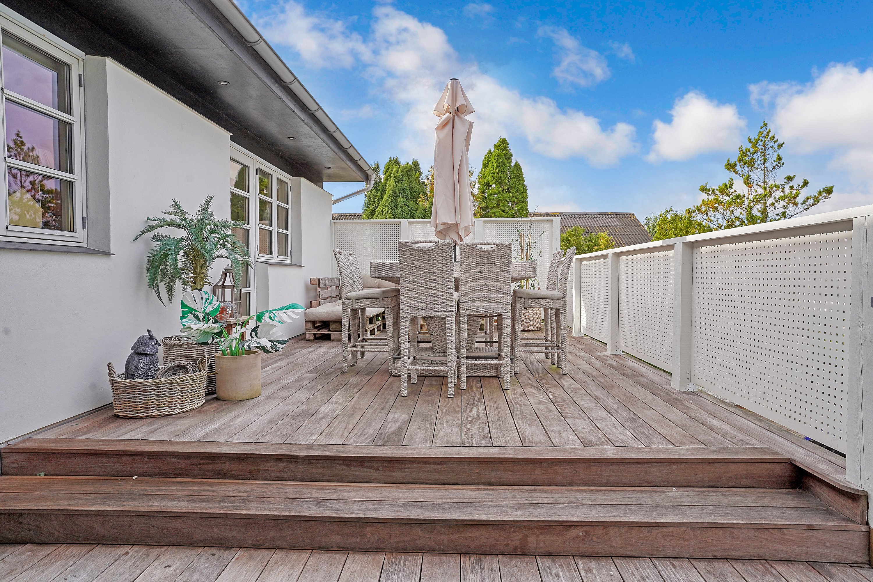Entre og værelsesafdelingen byder på fire gode værelser hvor det ene har udgang til terrassen og et smukt badeværelse, der gør dagligdagen nem og elegant.
