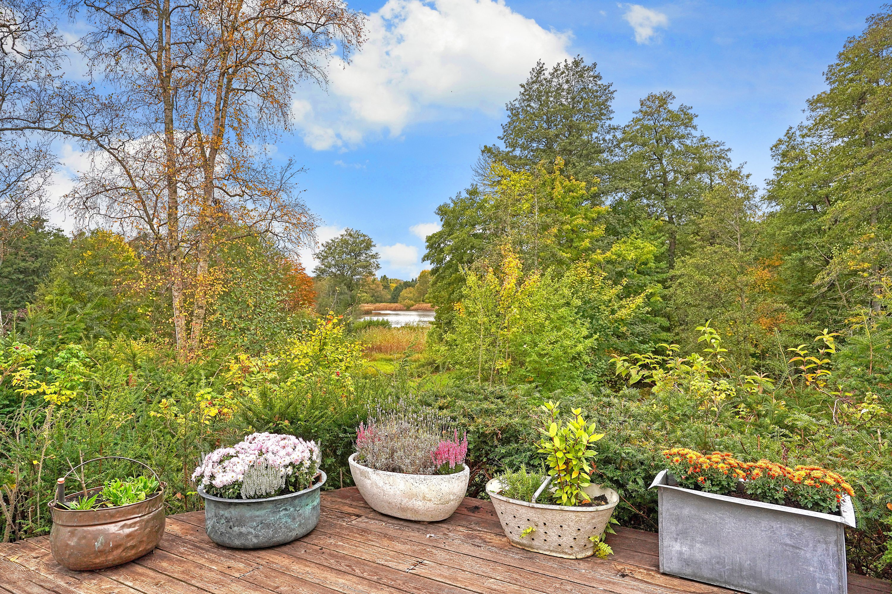 Huset og terrassen er hævet over søen, hvilket er med til at give en fantastisk udsigt. Fra terrassen går en lille sti ned til haven, der ligger direkte til bækken, der forbinder søerne samt søstien.
