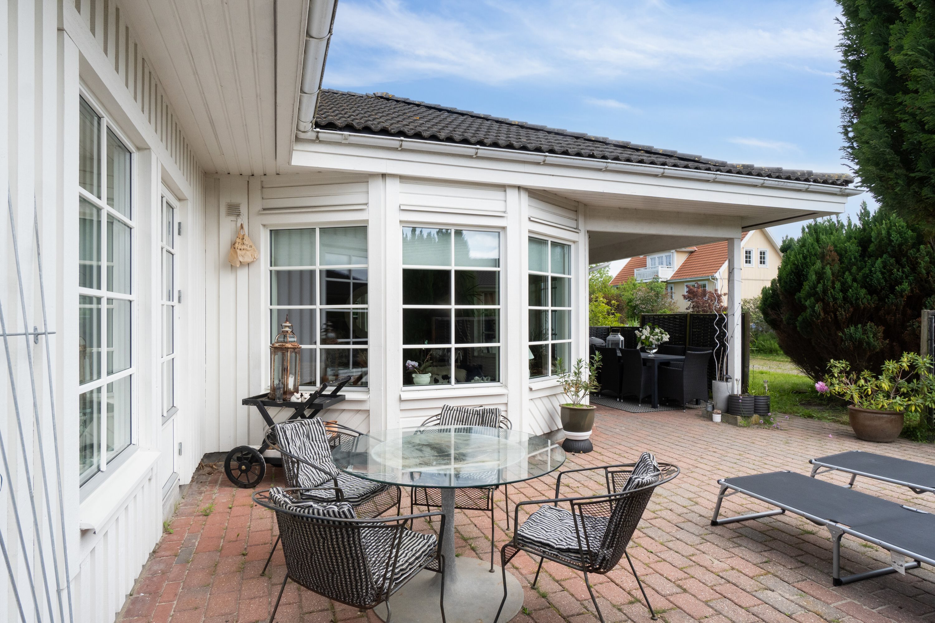 Udenfor finder I en god carport og flere skønne terrasseområder, hvor I kan sidde både overdækket og i solen og her venter mange hyggelige sommeraftener med grill og kold rosé. Haven er rigtig skøn og der er god plads til, at børnene kan tumle rundt, mens I slapper af i solen.
