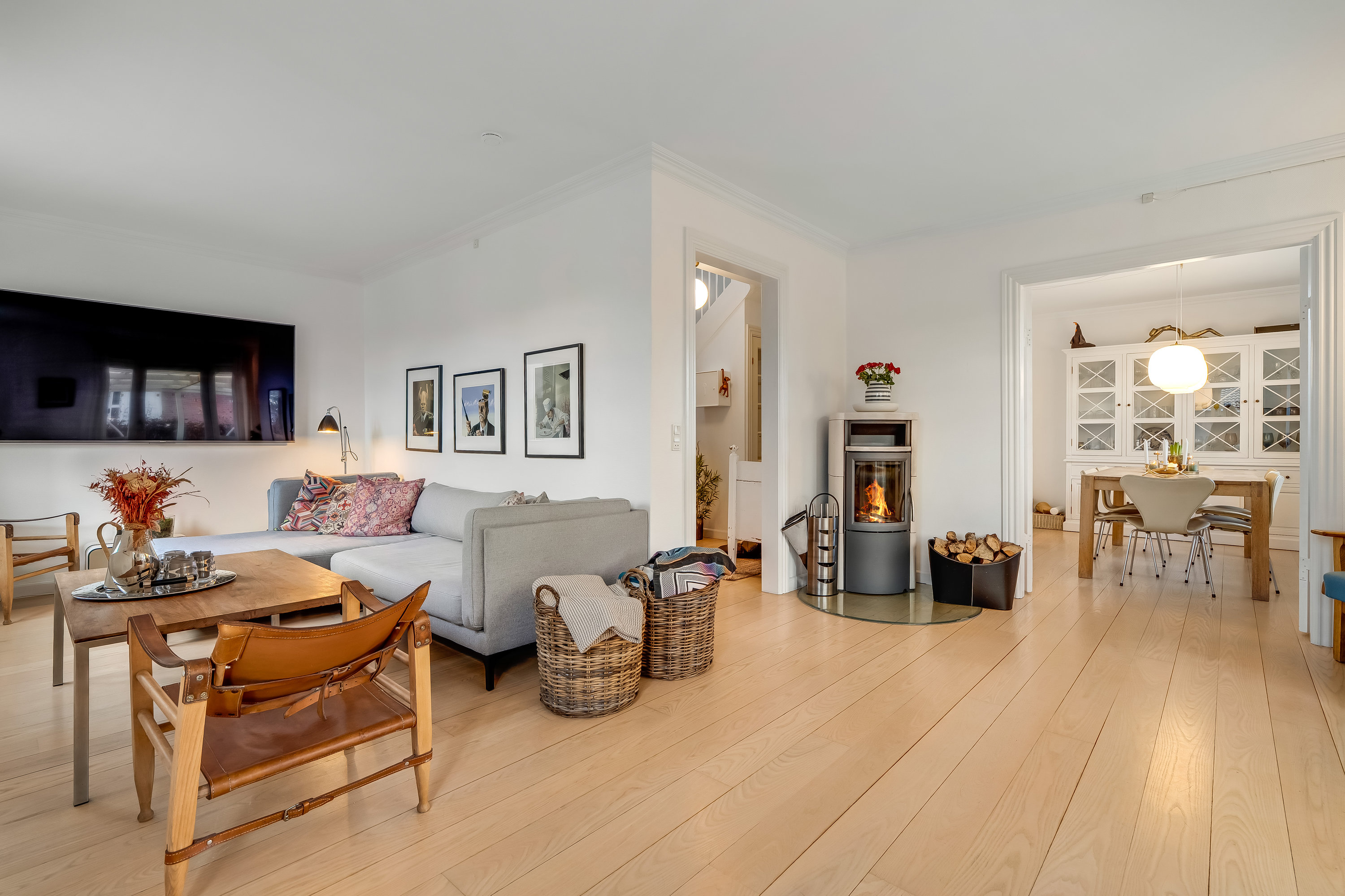 Man mærker straks det, sælgerne forelskede sig i: det dejlige lys, de luftige rum og en stemning af ro. Stuen modtager morgensolen, og på førstesalen ligger tre værelser, hvor udsigten og dagslyset skaber en særlig rolig atmosfære. Huset rummer to badeværelser—et i kælderen fra 2018 og et på førstesalen fra 2022—samt et køkken fra 2022 med et moderne og funktionelt udtryk.