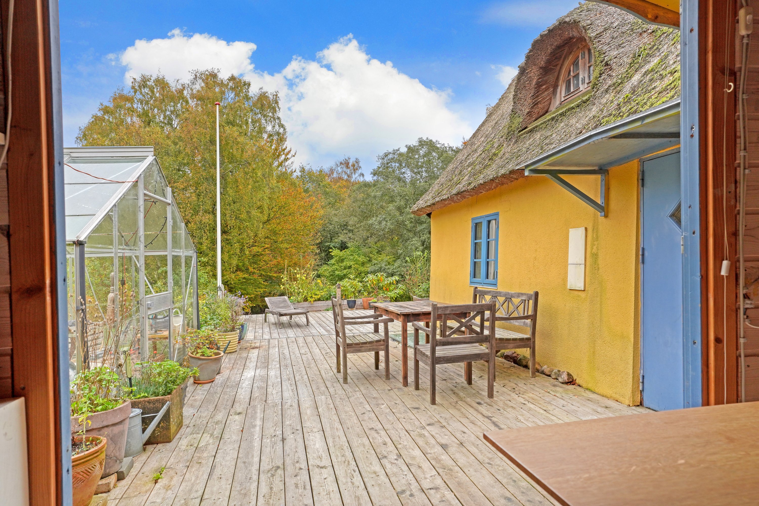 I stueetagen: entré, stor stue med køkken, badeværelse. 1. sal: Soveværelse med flot klædeskab i hele husets længde. Hvad der virkelig karakteriserer boligen, er forbindelsen til udearealerne. Den store træterrasse folder sig ud mod haven med idyllisk udsigt og giver plads til både morgenkaffe, urtekrukker og lange sommeraftener. Huset ligger på en grund, hvor grønt og natur er lige uden for døren... plads til leg, køkkenhave og stille stier mellem træerne. Her er drivhus og fine højbede, så du kan høste egne grøntsager, og det lille udhus/anneks inviterer til atelier, hjemmekontor eller ekstra opbevaring.