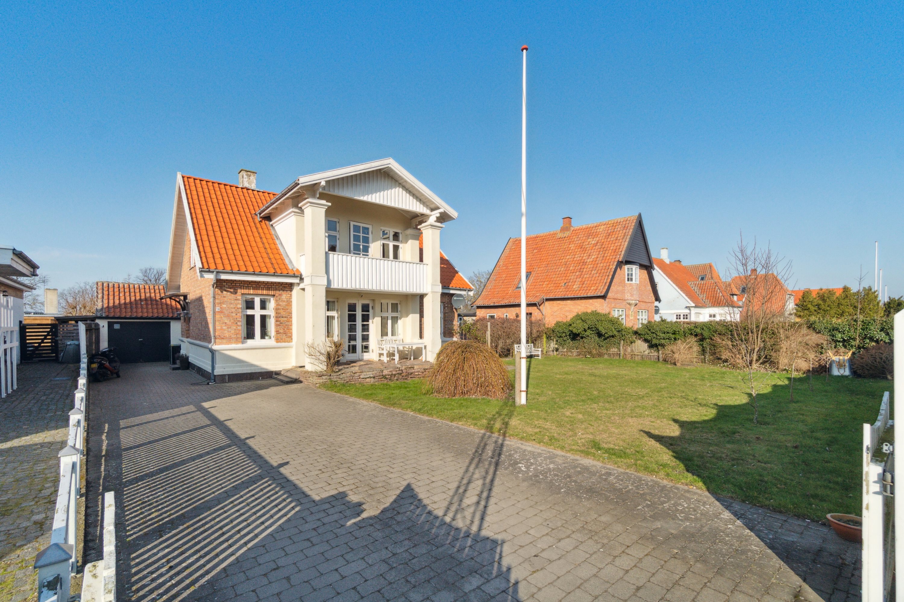 Den velholdte rødstensvilla er udsmykket med elegante detaljer såsom det markante fremspring med søjler og balkon, der giver huset dets karakter. I forhaven, der orienterer sig mod syd, ses en flagstang, og det hvide stakit bidrager også til det charmerende førstehåndsindtryk.