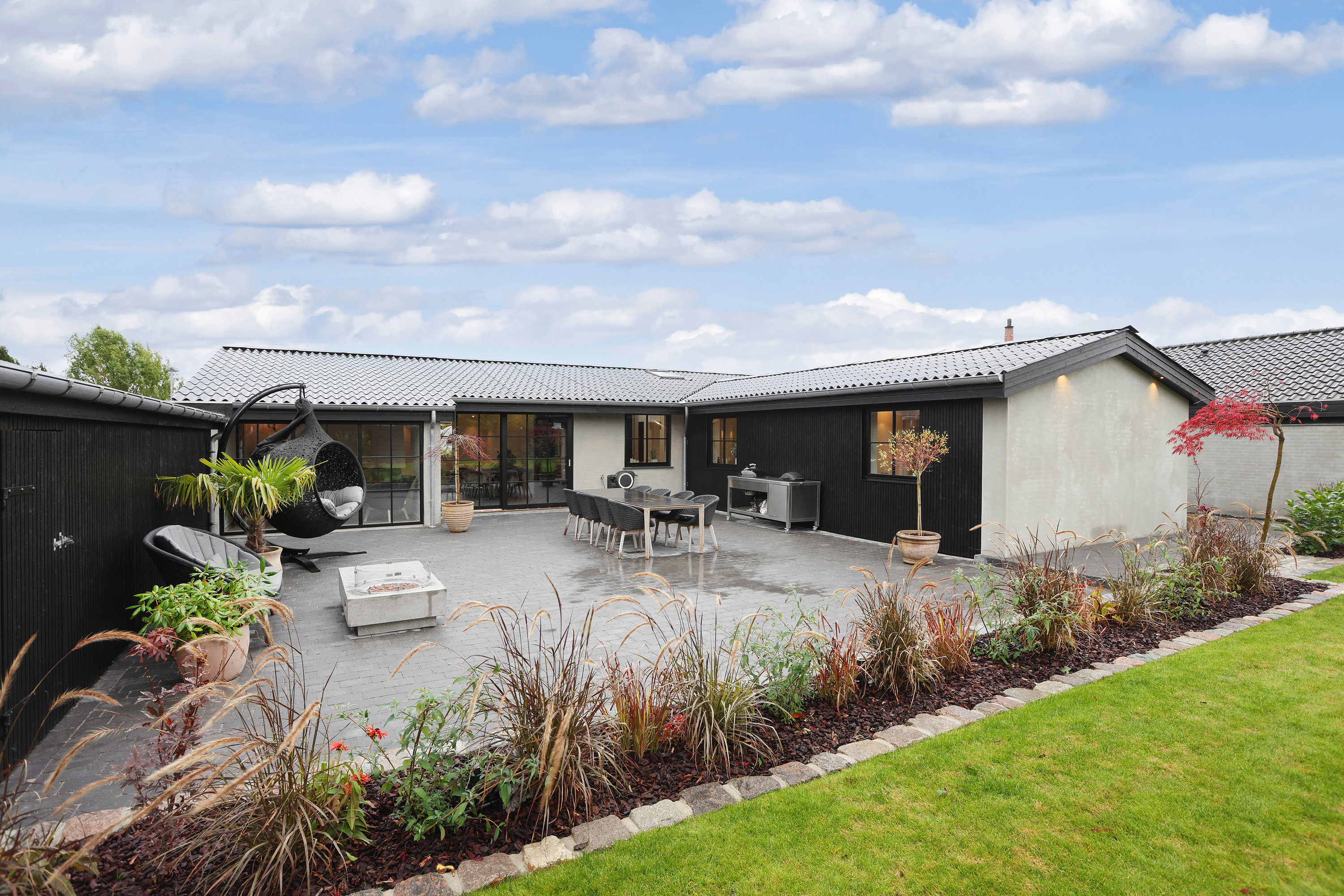 Fra spiseområdet er der direkte udgang til terrassen, hvor morgenkaffen kan nydes i solen, og grillmiddage kan strække sig langt ud på aftenen. Haven er let at holde og giver plads til både leg og afslapning. De store glaspartier mod haven skaber en glidende overgang mellem inde og ude, så naturen føles som en naturlig del af hjemmet. Et praktisk udhus giver ekstra plads til opbevaring eller hobbyprojekter.